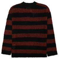 The Junya Watanabe MAN Striped Sweater in Black/Brown reflects a simple yet refined design. It showcases a striped pattern and is made from 100% cotton, offering comfort and durability. The sweater has an oversized fit and features a ribbed crewneck, cuffs, and hem. Distressed details add a subtle edge to the piece. Crafted in Japan, this garment combines traditional style with a hint of modernity. - 100% Cotton - Oversized fit - Striped pattern - Ribbed crewneck, cuffs, and hem - Distressed details - Made in Japan - Style No: WM-N001-051 BLKXBRW