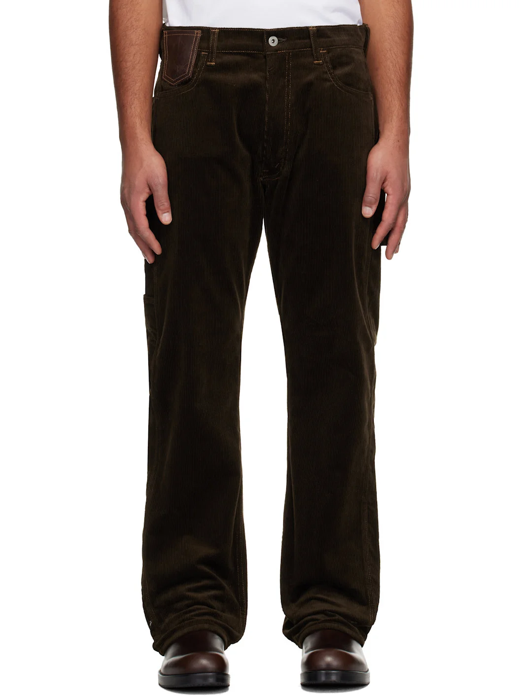 Stretch cotton corduroy trousers. · Belt loops · Five-pocket styling · Grained leather coin pocket and back pockets · Zip fly · Hammer loop at outseam · Patch pockets at outseam · Logo-engraved silver-tone hardware · Contrast stitching in tan Part of the Junya Watanabe MAN collection. Supplier color: Brown Body: 98% cotton, 2% polyurethane. Trim: 100% leather. Made in Japan 252253M191001