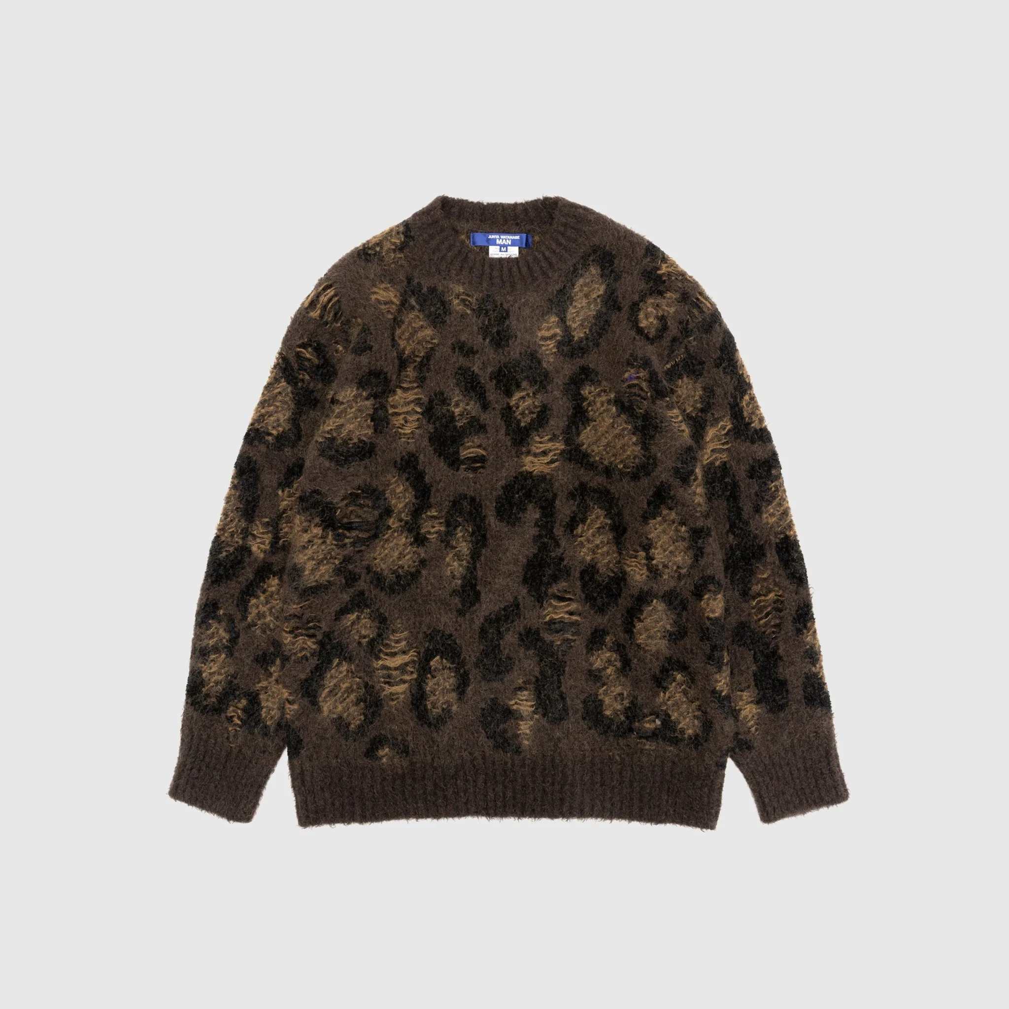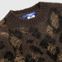 - WN-N033-051-1 - Brown - 55% Wool, 25% Rayon, 20% Nylon - Wool blend jacquard knit - Distressed detailing throughout - Ribbed collar, cuffs, and hem - FW24 - Made in Japan