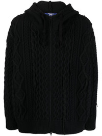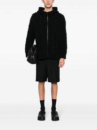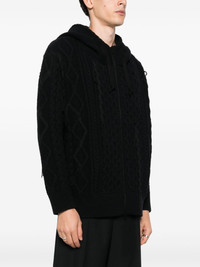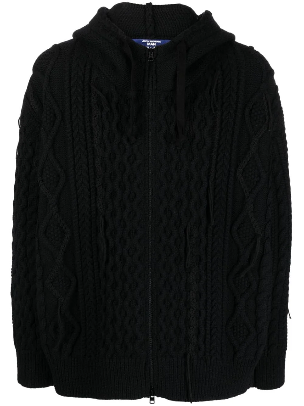 cable-knit drawstring hoodie Highlights - Black - Wool blend - Cable knit - Frayed detailing - Drawstring hood - Front two-way zip fastening - Drop shoulder - Long sleeves - Two side zip-fastening pockets - Ribbed cuffs and hem Imported Composition Wool 95%, Polyester 5% SIZE & FIT Model measurements Height 6 ft 2 in(1.87 m) Bust/Chest 36.41 in(92.5 cm) Hips 35.43 in(90 cm) Waist 29.52 in(75 cm) FittingInformation Designed to be unstructured, offering a loose fit throughout Made with a midweight knit, this piece offers some stretch This piece fits true to size – take your usual size Washing instructions Dry Clean Only