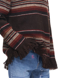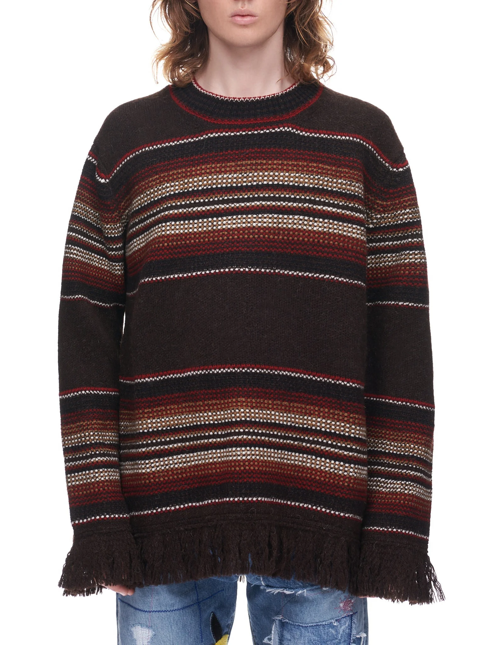 Junya Watanabe MAN sweater in brown, fringe detailing along cuffs and hemline, horizontal stripe pattern, crew neck collar, slight drop shoulder, long sleeves. Made in Japan Standard Sizing Composition: 100% Wool Model is 5'9" and is wearing size M. Shoulders: 18" Chest: 37" Waist: 29"
