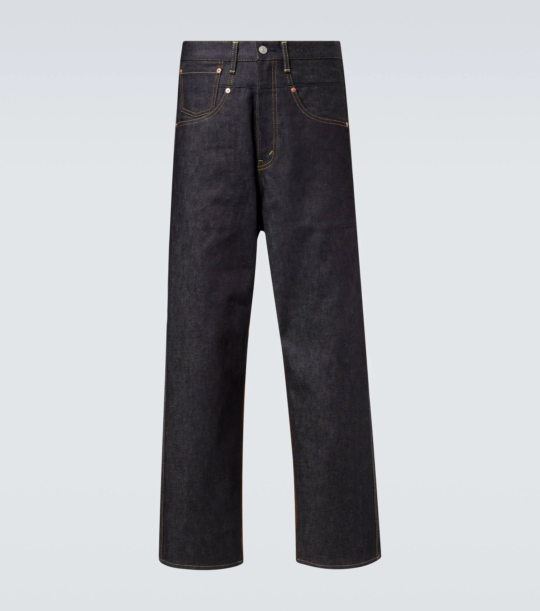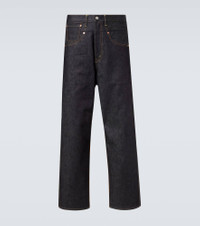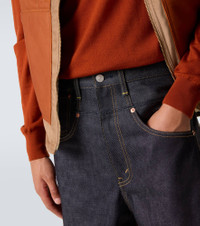 With experimentation at its core, Junya Watanabe creates avant-garde styles by manipulating fabrics and subverting classic codes. These high-rise straight jeans are designed with a contrasting corduroy back panel and feature a leather logo patch. Product Details - Material: 100% cotton - Care instructions: machine wash cold - Made in Japan - Designer color name: Indigo X Brown - Item color: blue - Trim: 100% cow leather - Pockets: five pockets - Closure: zip and button fastening - Belt loops - Contains non-textile parts of animal origin - Item number: P01098223 Size & Fit - True to size - Non-stretchy fabric - Straight leg - Mid-rise - The model in the picture is 185cm-6'1" and wearing a size L