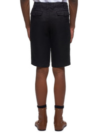 Junya Watanabe man linen deck shorts in black, buttoned closure, zippered fly, front buttoned coin pouch pocket, front slash hand pockets with buttoned closure, rear flap pockets with buttoned closure, straight/finished hem, tonal stitching. Made in Japan. Composition - 100% Linen Model is 6ft 2” and wearing a size S. Shoulders: 22” Chest: 37” Waist: 28”