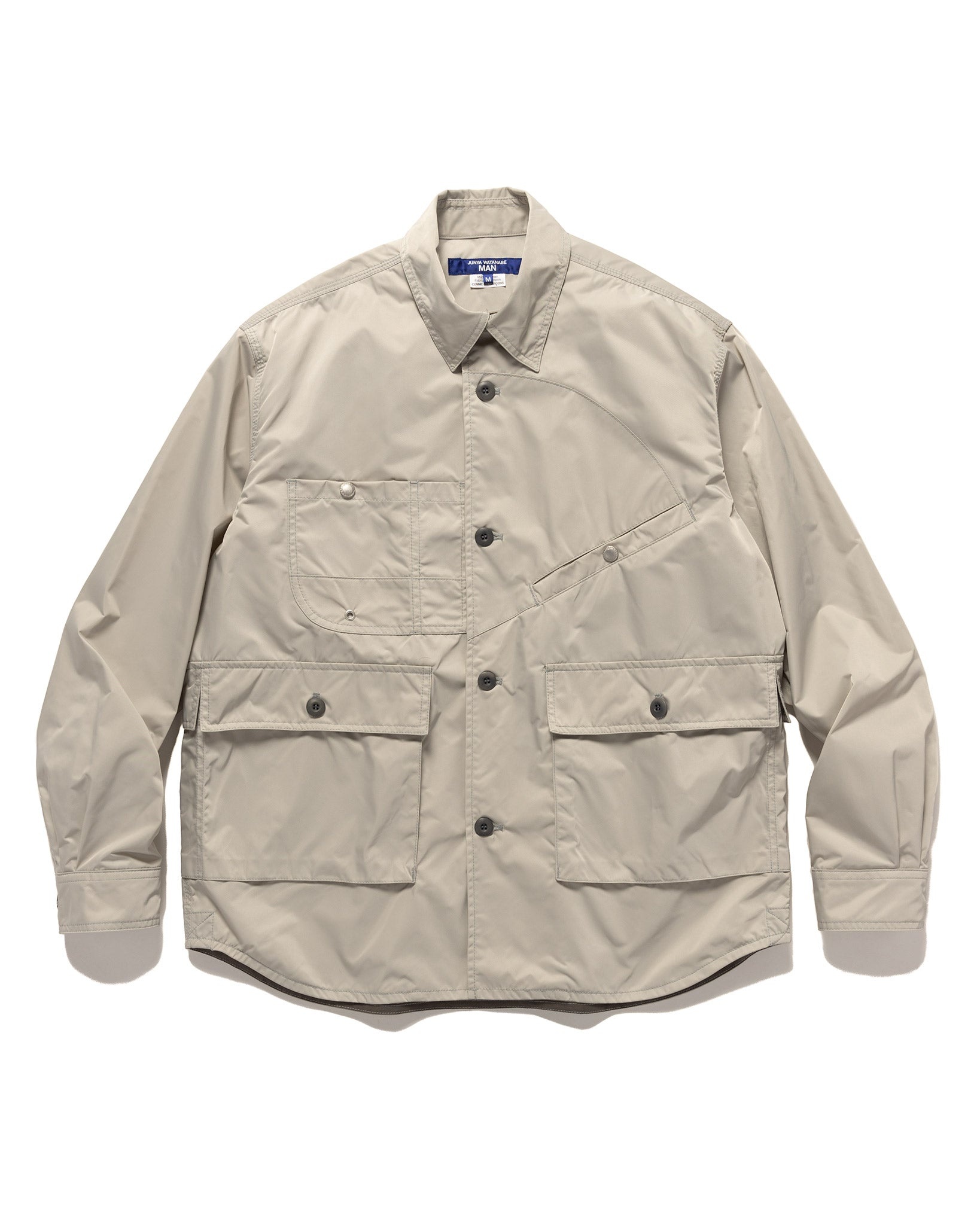 A seemingly simple shirt that upon closer imspection is a masterclass in pattern cutting. Utilising Junya Watanabe's typical maximalist design this shirt has a multitude of pockets built into and onto its front panel. The smooth, durable nylon twill and casual, relaxed fit provide versatility for styling, allowing it to be worn as a shirt or a light outer layer. An adaptable and functional piece to transition through the seasons. DETAILS - WM-B008-051 - 100% polyester - Relaxed fit - Pleated sleeves - Snap closure chest pockets - Button closure hand pockets - Hidden chest pocket in placket - Button closure - Button cuffs - Made in Japan