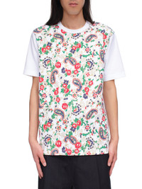 Junya Watanabe Man shirt in white, crew neck collar, short sleeves, paisley pattern throughout front panel. Made in Japan. Standard Sizing. Composition: 100% Cotton. Model is 6'2" and is wearing a size M Shoulders: 18" Chest: 36" Waist: 28"