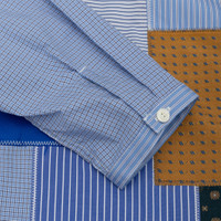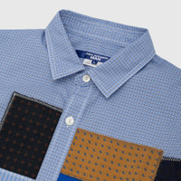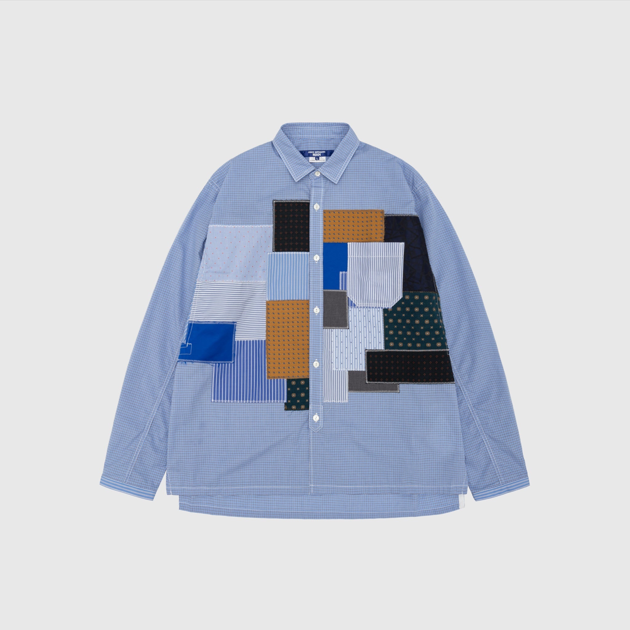 - WO-B009-051-1 - Sax/White/Mix - 100% Cotton - Patchwork detailing - Front button closure - Front chest pocket - Adjustable button cuffs - SS25 - Made in Japan