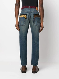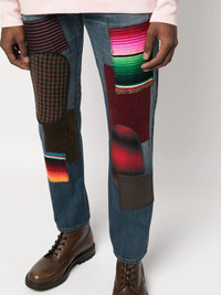 patchwork-design slim-cut jeans indigo blue cotton/wool/calf leather slim cut denim patchwork design belt loops front button and zip fastening classic five pockets Imported Composition Cotton 100%, Other fibres 100%, Calf Leather 100%, Wool 96%, Acrylic 93%, Polyester 7%, Nylon 4% SIZE & FIT Model measurements Height 6 ft 2 in(1.88 m) Bust/Chest 36.61 in(93 cm) Hips 35.82 in(91 cm) Waist 27.95 in(71 cm) FittingInformation This piece fits true to size. We recommend you get your regular size Cut for a slim fit Made with a mid-weight non-stretch fabric Washing instructions Dry Clean Only