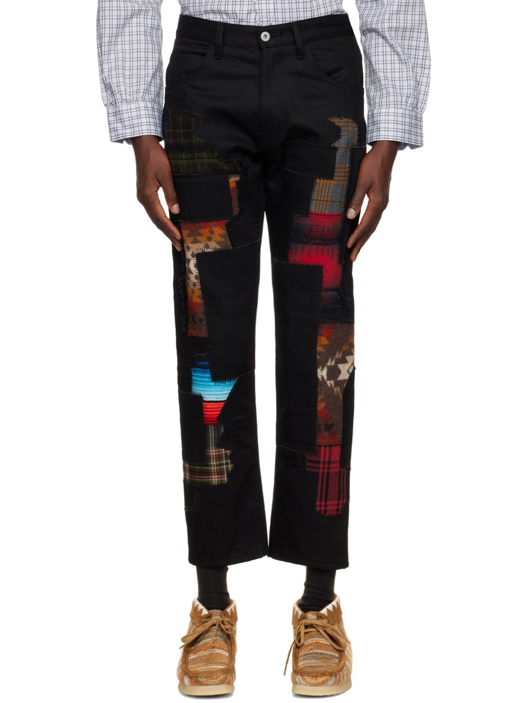 Non-stretch left-hand twill denim jeans. Distressing, frayed edges, and underlays with graphic pattern throughout. · Paneled construction · Belt loops · Five-pocket styling · Zip-fly · Logo-engraved silver-tone hardware Supplier color: Black mix Body: 100% cotton. Trim 1: 93% acrylic, 6% polyester, 1% other. Trim 2: 55% wool, 45% cotton. Trim 3: 82% wool, 18% cotton.