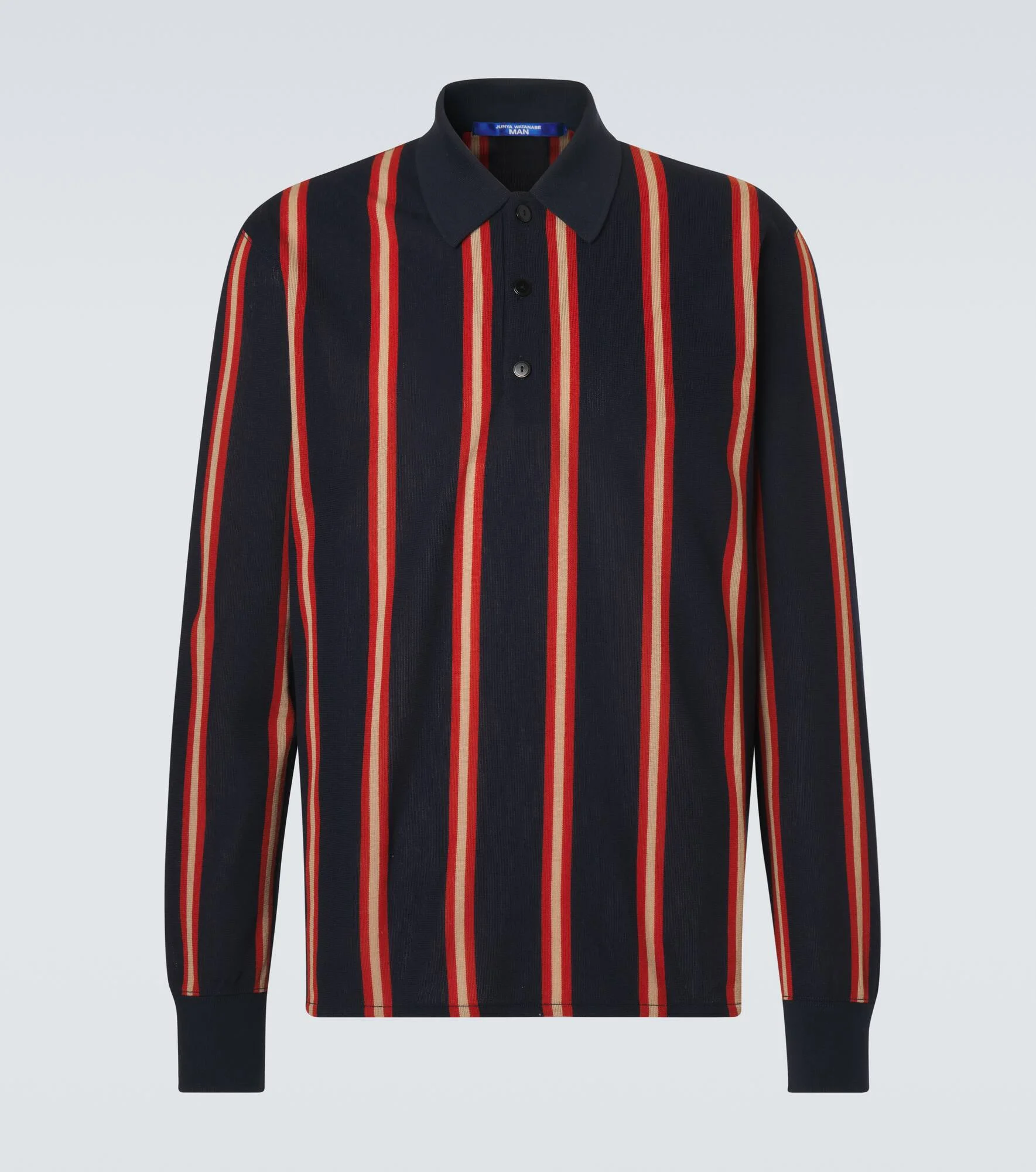 With experimentation at its core, Junya Watanabe creates avant-garde styles by manipulating fabrics and subverting classic codes. Crafted from wool, this polo shirt features a charming striped print. Product Details - Material: 100% wool - Care instructions: dry clean - Made in Japan - Color: blue - Designer color name: Nyv/Org/Bge - Trim: 100% cotton - Collar: polo collar - Closure: partially buttoned front - Item number: P01165728 Size & Fit - True to size - Straight fit - Slightly stretchy fabric - Falls below the hip - Height of model is 192cm-75.5" and wears a size L