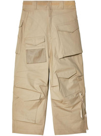 sand beige layered details belt loops multiple cargo pockets wide leg Size & Fit Model Measurements: Bust: 0cm Height: 0cm Hips: 0cm Waist: 0cm Fabric and Care Designer Style ID: WMP020 Designer Colour: 1 - OFF BEIGE Composition: Cotton 100%, Nylon 100% Washing instructions: Read Manufacturer Guidelines Made in Japan