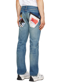 Non-stretch denim jeans. Fading and whiskering throughout. · Belt loops · Five-pocket styling · Button-fly · Striped trim and graphics printed at back pockets · Contrast stitching in tan Part of Junya Watanabe MAN's Jean-Michel Basquiat capsule collection. Supplier color: Indigo white/Red blue