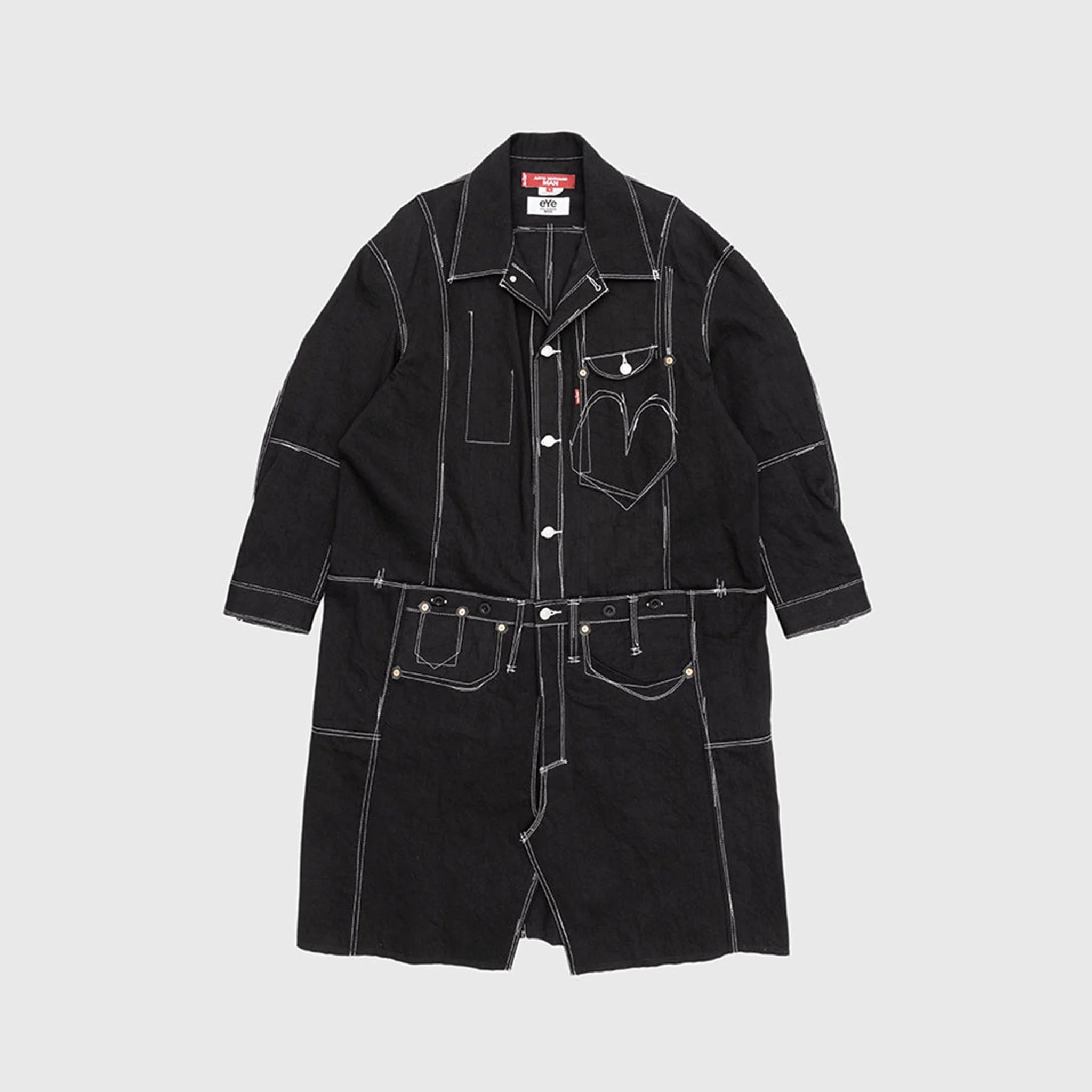 - WL-C901-100-2 - Black/White - 100% Wool - Raw denim - Paneled construction - Front button closure - Front chest pocket with flap and button closure - Multiple rear patch pockets - Interior pockets - Contrasting stitching throughout - Oversized pointed collar - Adjustable button cuffs - Adjustable buckle strap in the back - Raw cut hem - FW23 - Made in Japan