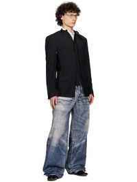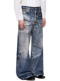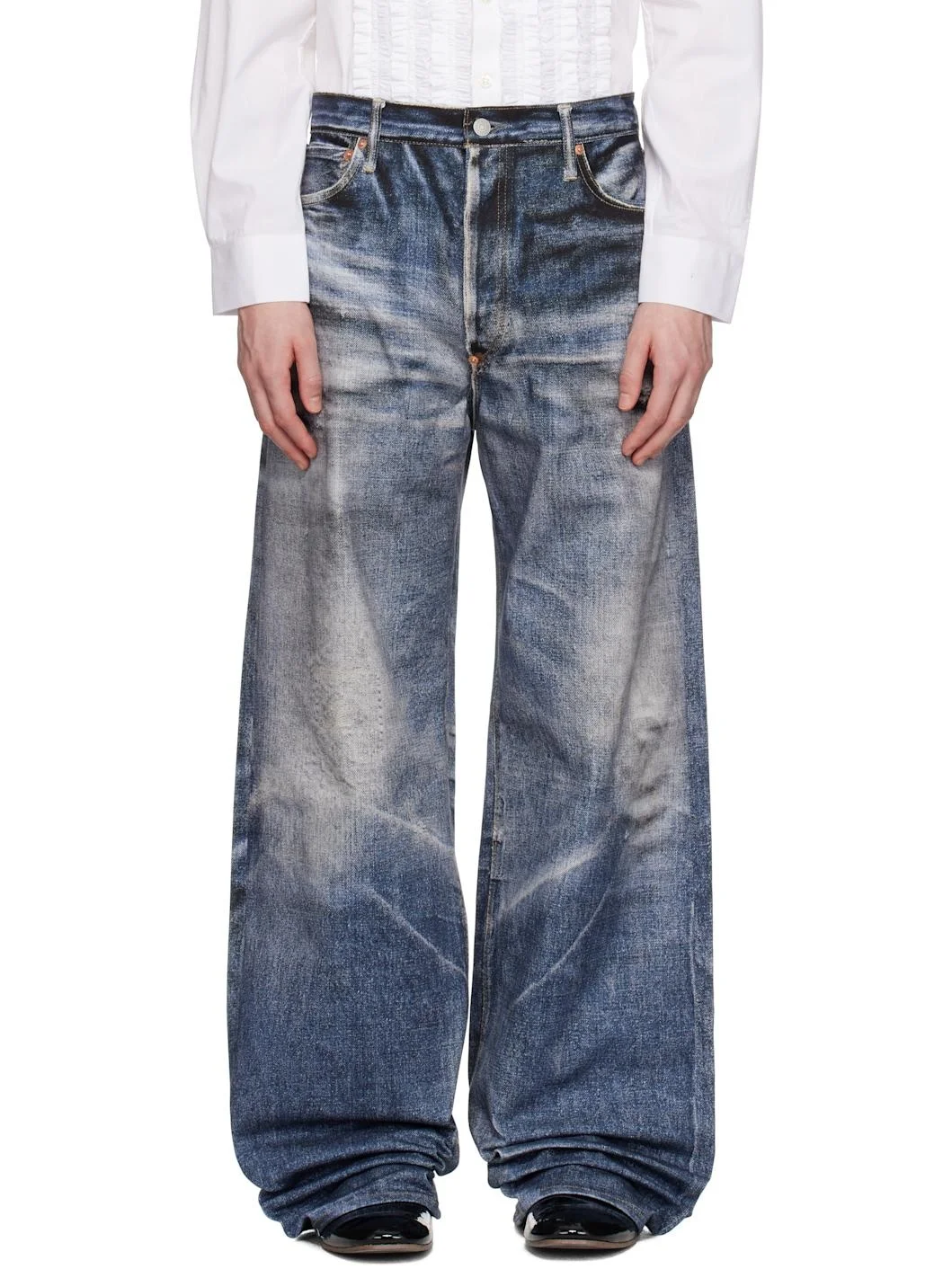 Non-stretch denim jeans. Trompe l'oeil graphic printed throughout. · Belt loops · Five-pocket styling · Button fly · Cinch strap and logo patch at back waistband · Logo flag at back pocket · Logo-engraved silver- and copper-tone hardware · Contrast stitching in tan Part of the Junya Watanabe x Levi's collaboration. Supplier color: Indigo Body: 100% cotton. Trim: 100% leather. Made in Japan 252253M186001