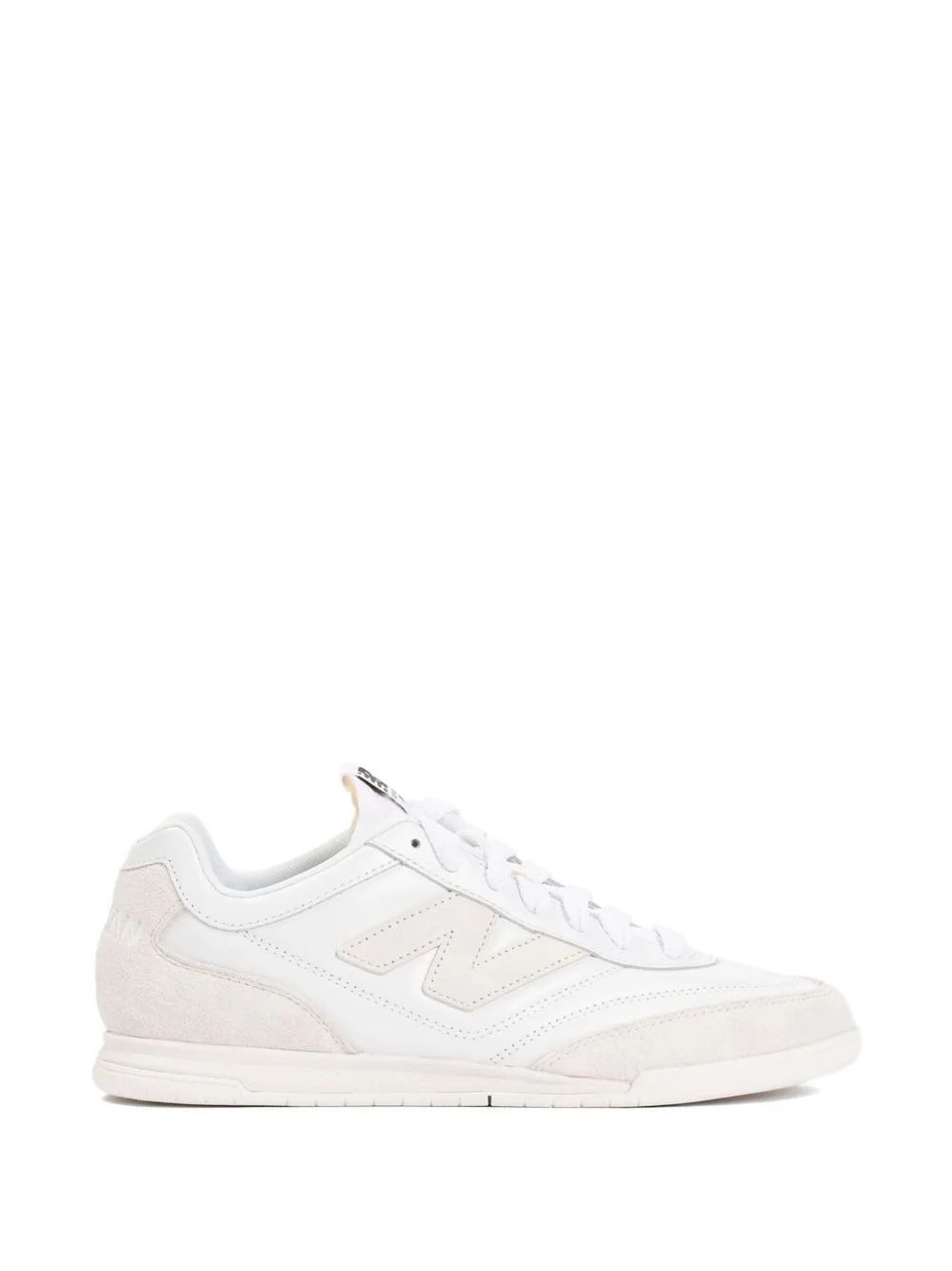 x New Balance leather logo sneakers Highlights - White - Logo patch - Lace-up fastening - Round toe - Flat sole Imported Composition Outer: Calf Leather 100% Lining: Fabric 100% Sole: Rubber 100%
