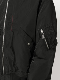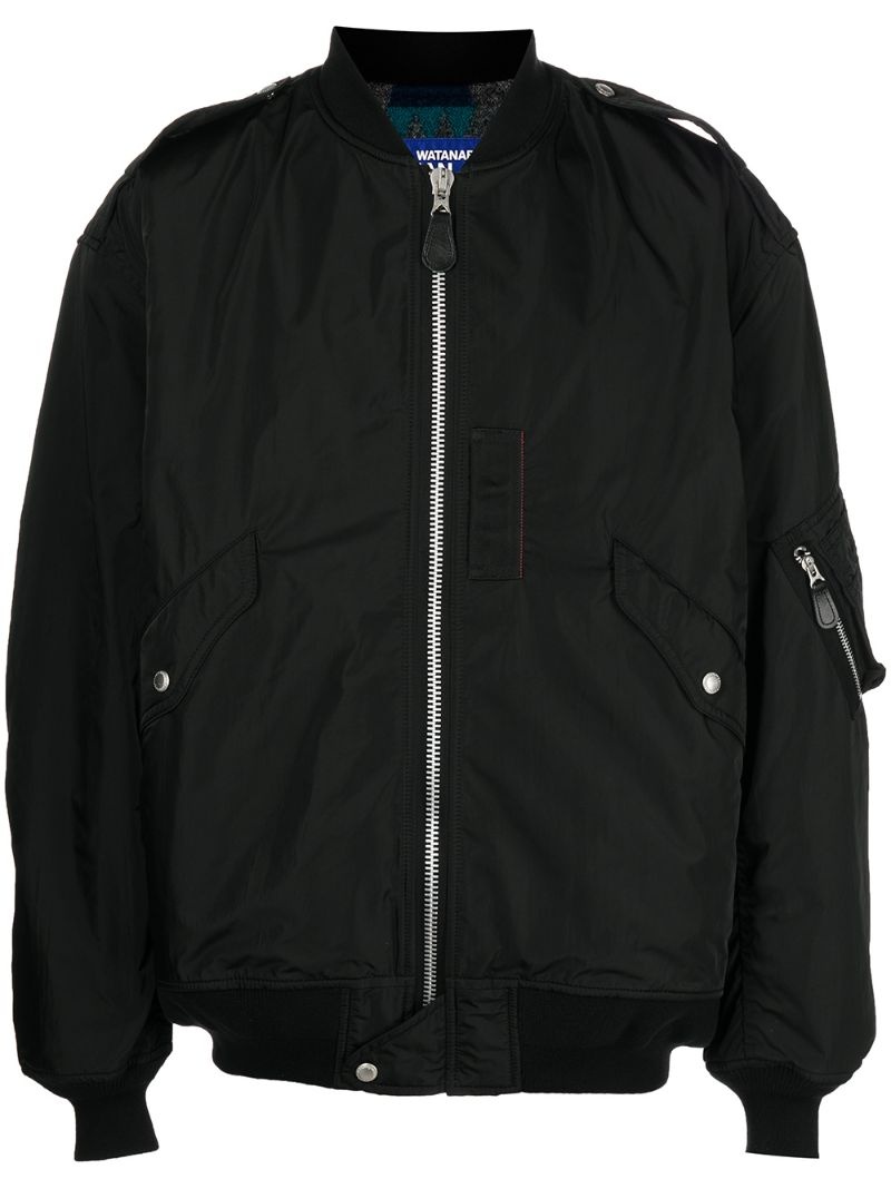 zip-up bomber jacket zip-up bomber jacket from Junya Watanabe MAN featuring silver-tone hardware, front zip fastening, two side flap pockets, sleeve zip pocket, band collar, long sleeves, elasticated cuffs, elasticated hem and black. Imported Composition Polyester 100% Trims: Nylon 100%, Wool 82%, Cotton 18% SIZE & FIT Model measurements Height 6 ft 2 in(1.88 m) Bust/Chest 38.2 in(97 cm) Hips 37 in(94 cm) Waist 29.9 in(76 cm)