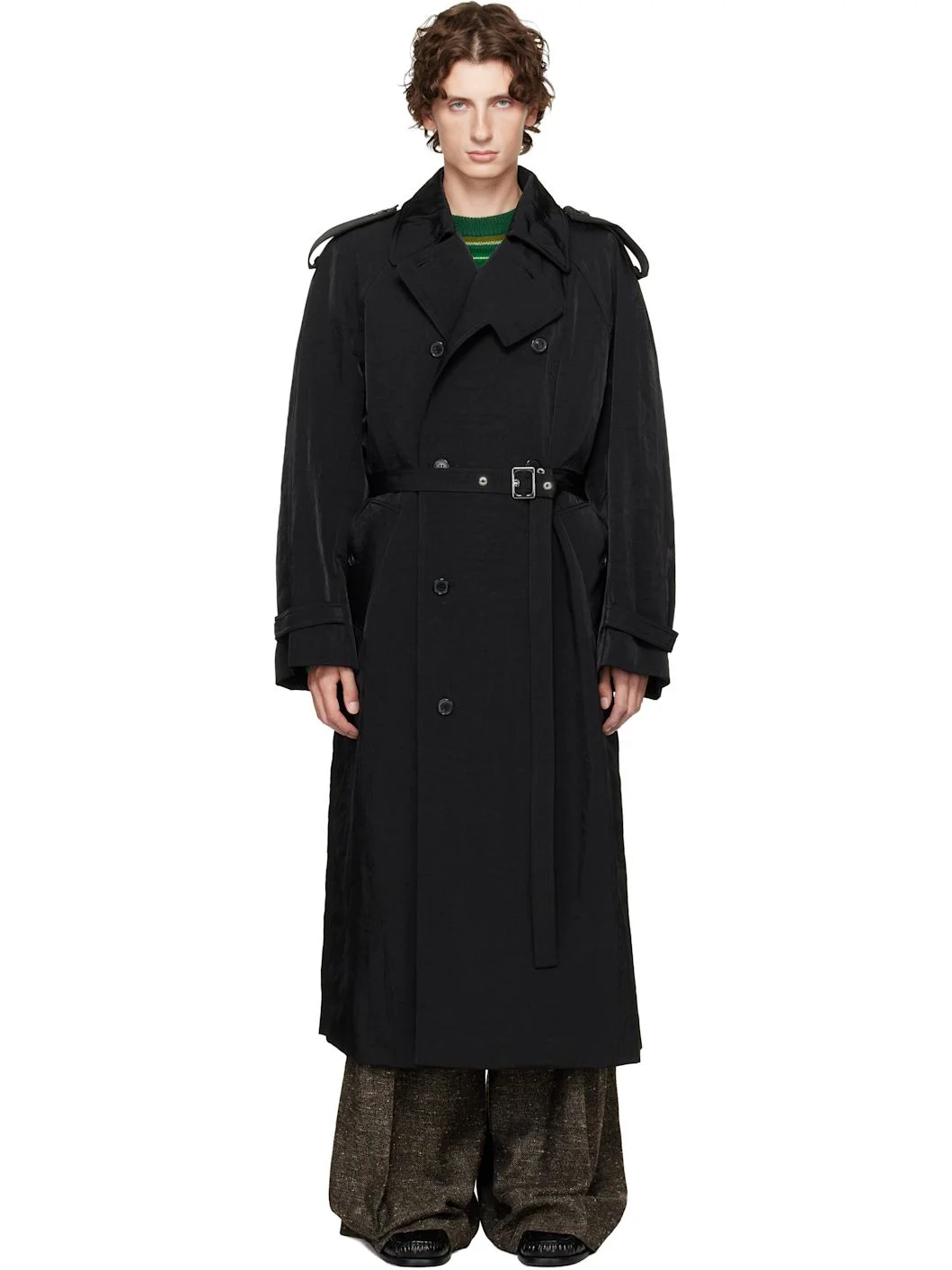 Nylon twill trench coat. · Spread collar · Double-breasted button closure · Welt pockets at waist · Belt loops and detachable pin-buckle belt · Raglan sleeves · Epaulets · Button tab at cuffs · Logo plaque at back collar · Storm flap at back yoke · Central vent at back hem Supplier color: Black Body: 100% nylon. Trim: 100% viscose. Made in Bulgaria 252477M184000