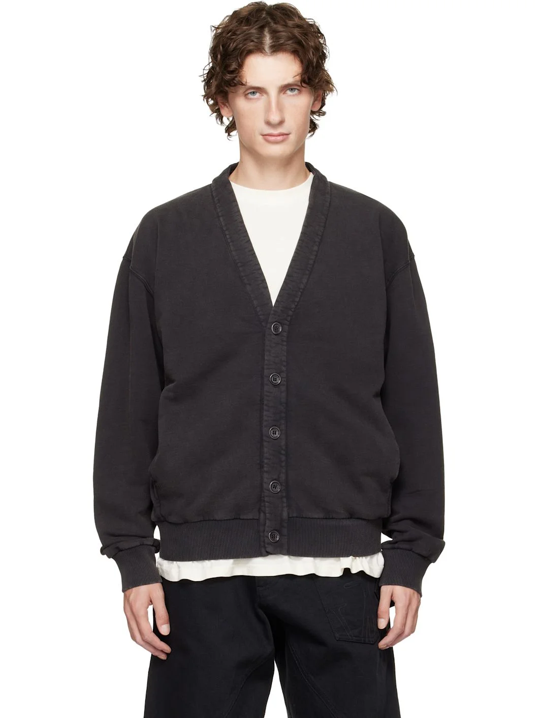 French terry cardigan. · Garment-dyed · Y-neck · Button closure · Seam pockets at waist · Rib-knit hem and cuffs · Dropped shoulders · Logo embroidered at back hem Supplier color: Washed black Body: 100% cotton. Trim: 98% cotton, 2% elastane. Made in Portugal 252477M200004