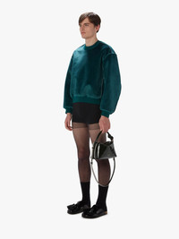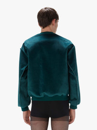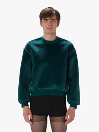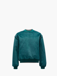 - Contrasting velvet-style panelled sweatshirt complete with bonded detailling - Dropped shoulder design - Ribbed crew neckline and cuffs - Boxy fit - take your usual size Additional Information - Colour: Deep Teal - Composition - Main (Front): 100% Polyester, Main (Back): 98% Cotton, 2% Polyester - Made in China