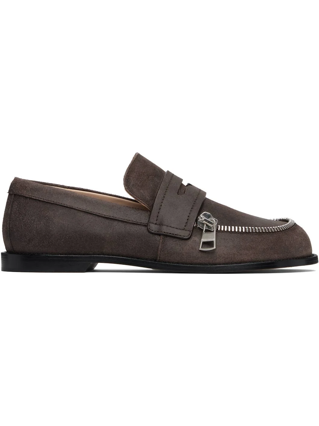 Suede loafers. · Zip detailing at moc toe · Strap with cutout at vamp · Buffed leather lining · Stacked leather heel with rubber injection · Leather sole Supplier color: Deep walnut Upper: leather. Sole: leather, rubber. Made in Italy 252477M239000