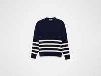 Buttoned sleeve breton crew neck jumper in navy engineered breton stripe with rib trims and horn button openings. Details - Colour: Navy - Composition [Main]: 100% Wool - Made in: Italy - Model [Wears]: Size S, 189cm Tall - SKU: KW1425YN0456888