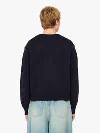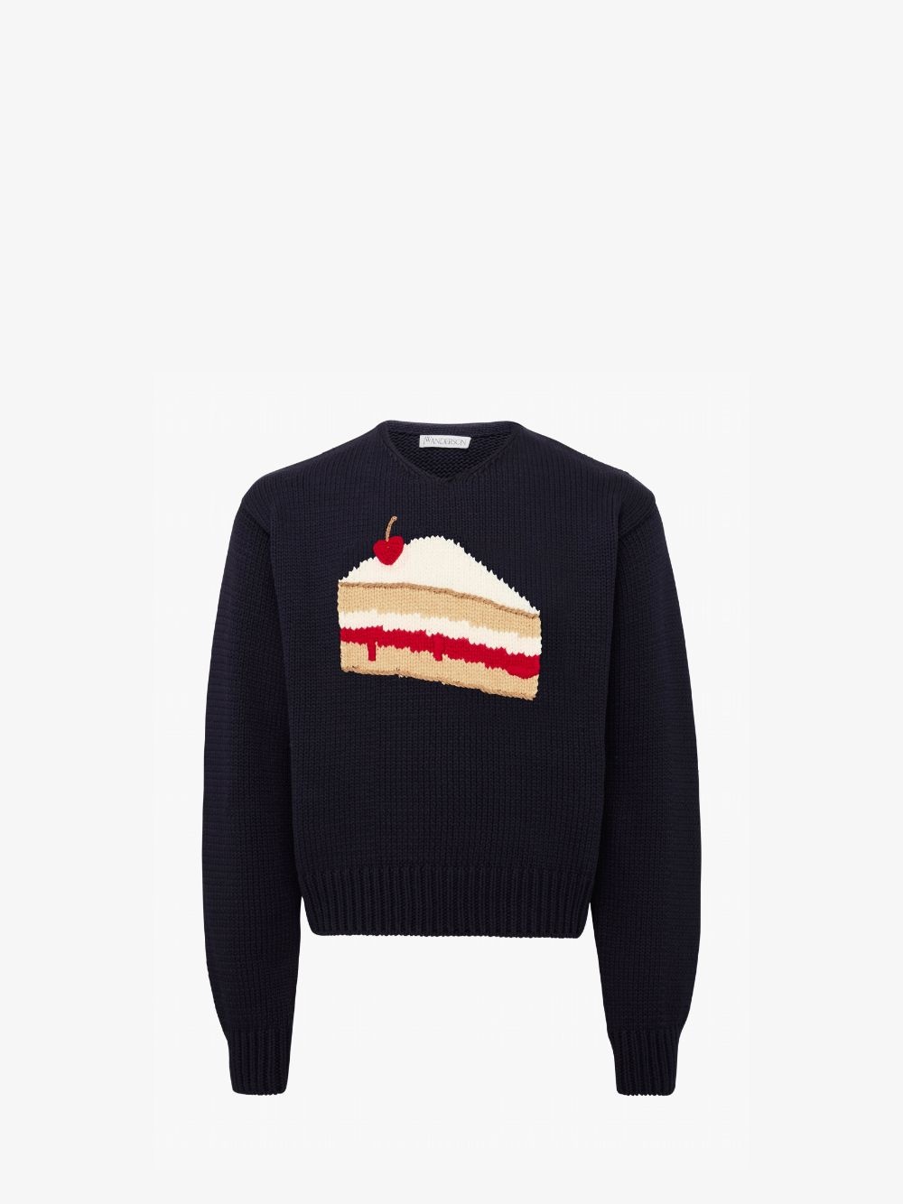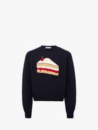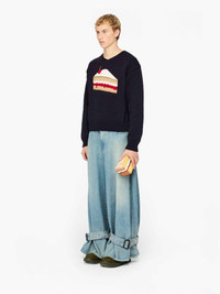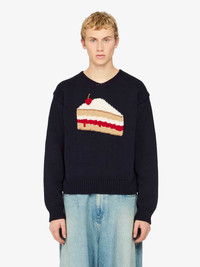 - Knitted sweater with shrunken silhouette, complete with intarsia "Victoria Sponge" motif - High V-neckline - Dropped shoulder - Black logo plaque on centre back - Ribbed cuffs and hem - For a more oversized fit, take a larger size Additional Information - Colour: Blue - Composition: 70% Cotton 30% Polyamide - Heavy-weight knitted fabrication - Made in: China - SKU: KW1346YN0417800