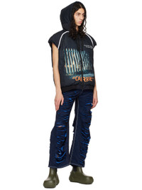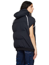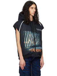 Padded nylon twill puffer vest. · Adjustable drawstring at hood · Zip closure · Graphic and text printed at front · Welt pockets · Partially elasticized rib knit hem · Piping trim at yoke · Quilted back · Full taffeta lining Part of the 'Carrie' collection. Supplier color: Black Body: 100% nylon. Trim: 100% polyester. Fill: 100% recycled polyethylene terephthalate. Lining: 100% polyamide. Made in Italy 222477M178001