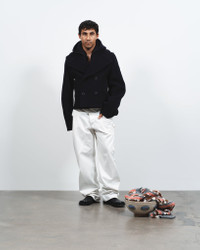 Double-breasted cropped peacoat crafted in the UK by a specialist outerwear maker. Features a removable button-off hood, bound internal seams, and horn buttons. Unlined for a clean, traditional finish. Both garment and factory are part of a British outerwear heritage. Details - Colour: Navy - Composition [Main]: 100% Wool - Composition [Lining]: 100% Cotton - Made in: United Kingdom - Model [Wears]: Size S, 189cm Tall - SKU: CO0346PG1870888