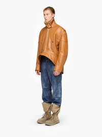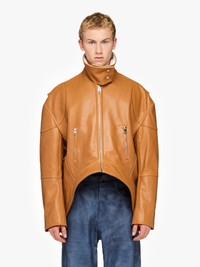 - Zip-front leather jacket, complete with curved asymmetric hemline - High collar with canvas detail and double snaps - Silver hardware - Quilted lining - Oversized fit, take your usual size Additional Information - Colour: Tan - Composition: 100% Leather - Mid-weight smooth leather fabrication - Made in: United Kingdom - SKU: LJ0047LT0117640