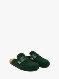 - Loafer mules complete in a textured felt fabrication - Calf leather front band and binding - Rounded toe - Wide fit style, if in-between sizes, take one size smaller than normal Details - Colour: Pine - Composition: 72% Cotton, 28% Polyamide - Lining: 100% Split Grain Sheep Leather - Sole: 100% Rubber - Heel Height: 15mm - Textured Felt Fabrication - Made in: Italy - SKU: LF0029FA0468555