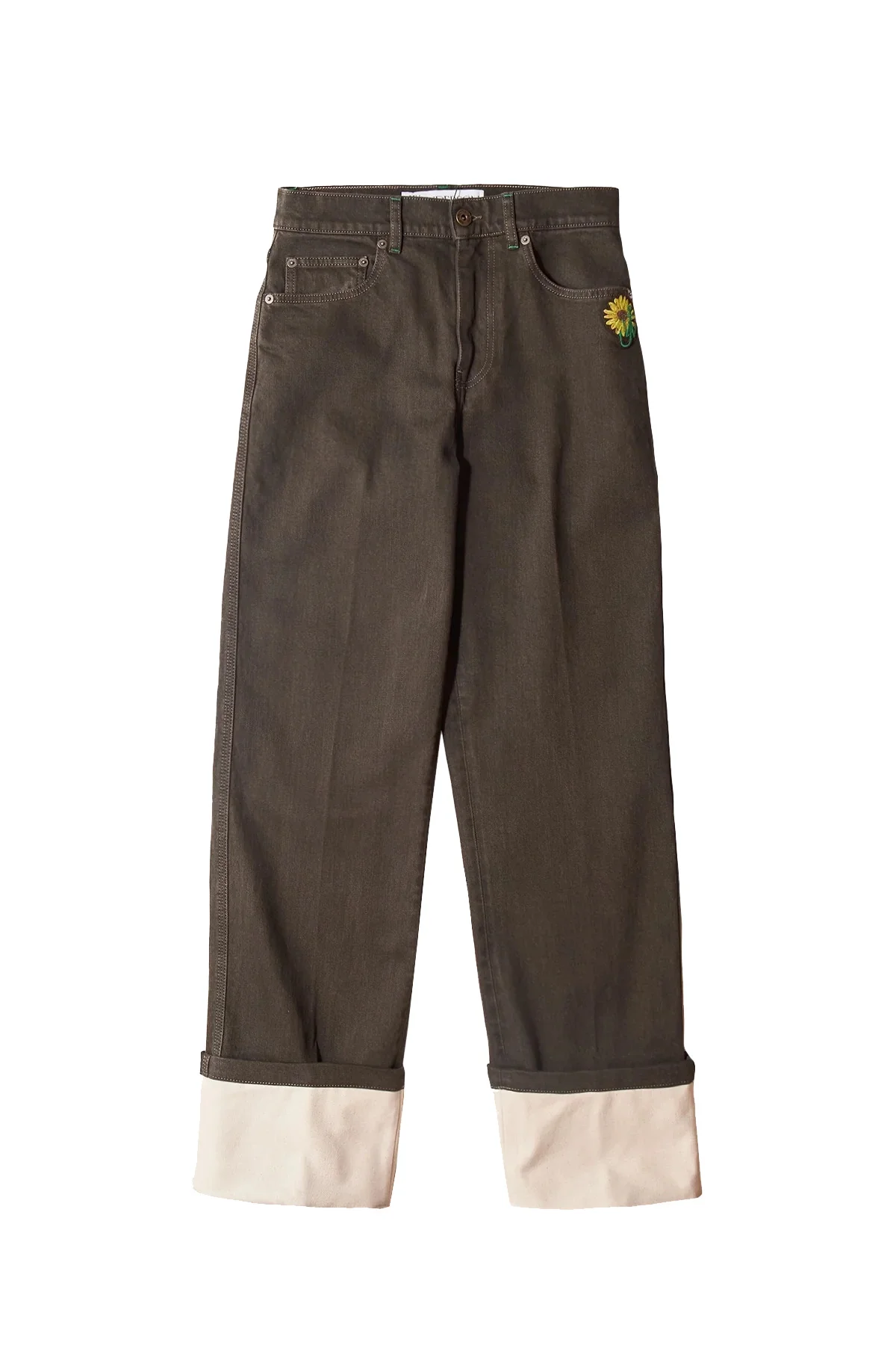 JW Anderson Contrast Turn Up Jeans in Brown featuring cuffed hems with contrast detailing, sunflower and logo embroidery, and a classic five-pocket design. This item is final sale and is not eligible for return or exchange. DETAILS - Denim pants - Cuffed hems - Sunflower embroidery at front - 5 pocket styling - Logo patch at back - Made in Portugal Sizing: - True to size Material: 100% Cotton Product codes: - SKU: ESSX/DT0100PG1673958/BROWN/28 - UPC: 1403558010559