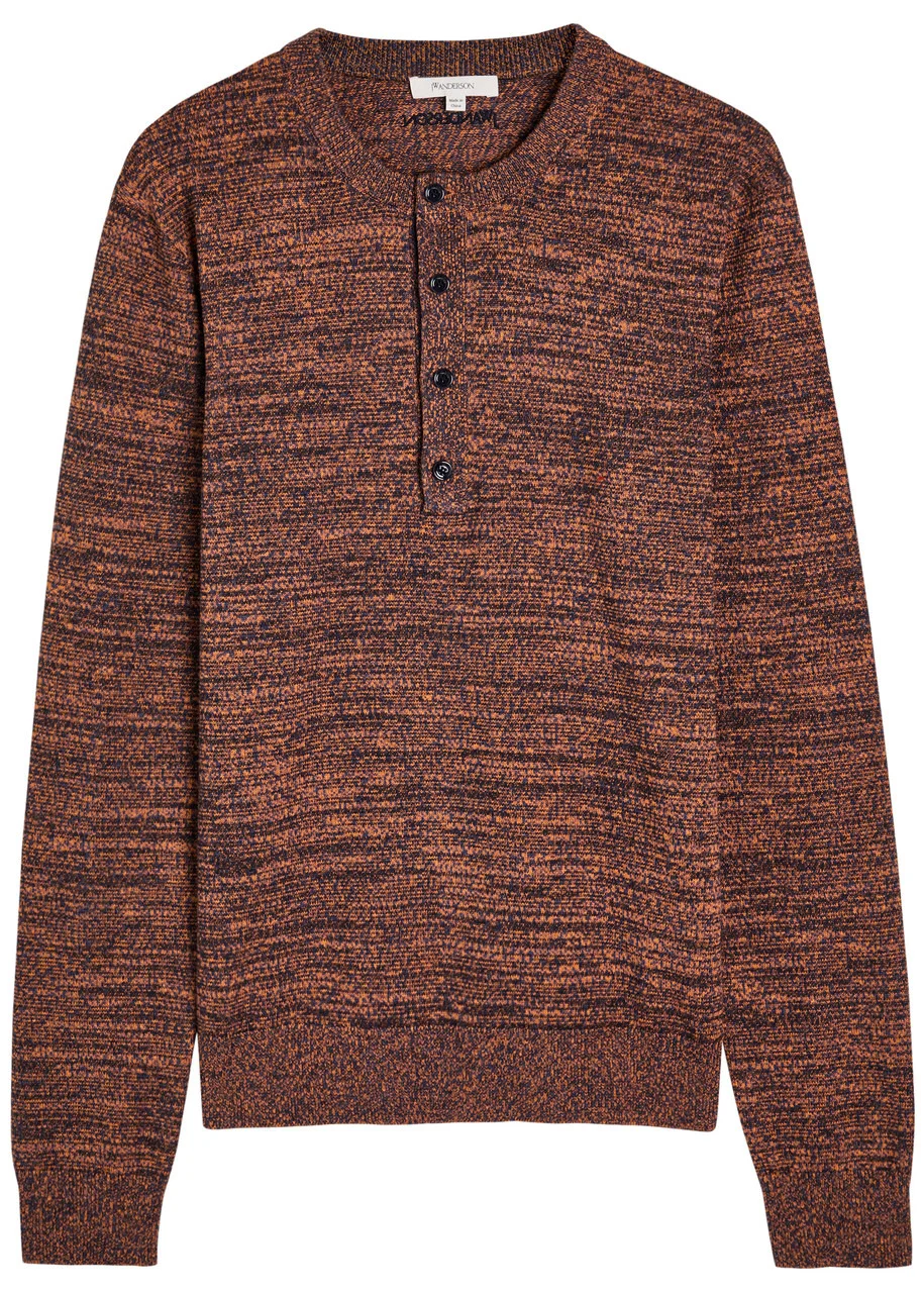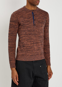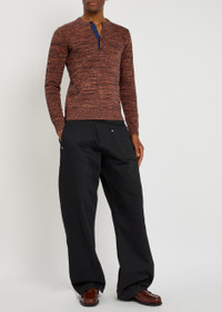 Info & Care JW Anderson knit jumper Melange, button-fastening round-neck, designer embroidery at back neck Slips on 45% cotton, 31% linen, 20% polyester, 4% polyamide Dry clean Size & Fit Length shoulder to hem: 25.5 inches/ 65cm Midweight Regular fit Model is 6'2"/ 188cm, chest size 38 inches and wears a size medium