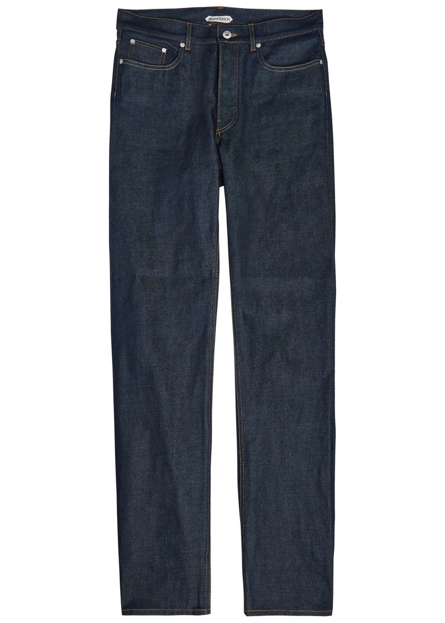 Info & Care JW Anderson denim jeans Mid-rise fit, straight-leg cut, belt loops, five pockets, designer plaque at back Partially concealed button fastenings at front 100% cotton Dry clean Size & Fit Front rise: 11 inches/ 28cm Inside leg length: 35 inches/ 89cm Midweight Model is 6'1"/ 185cm and wears a size W32