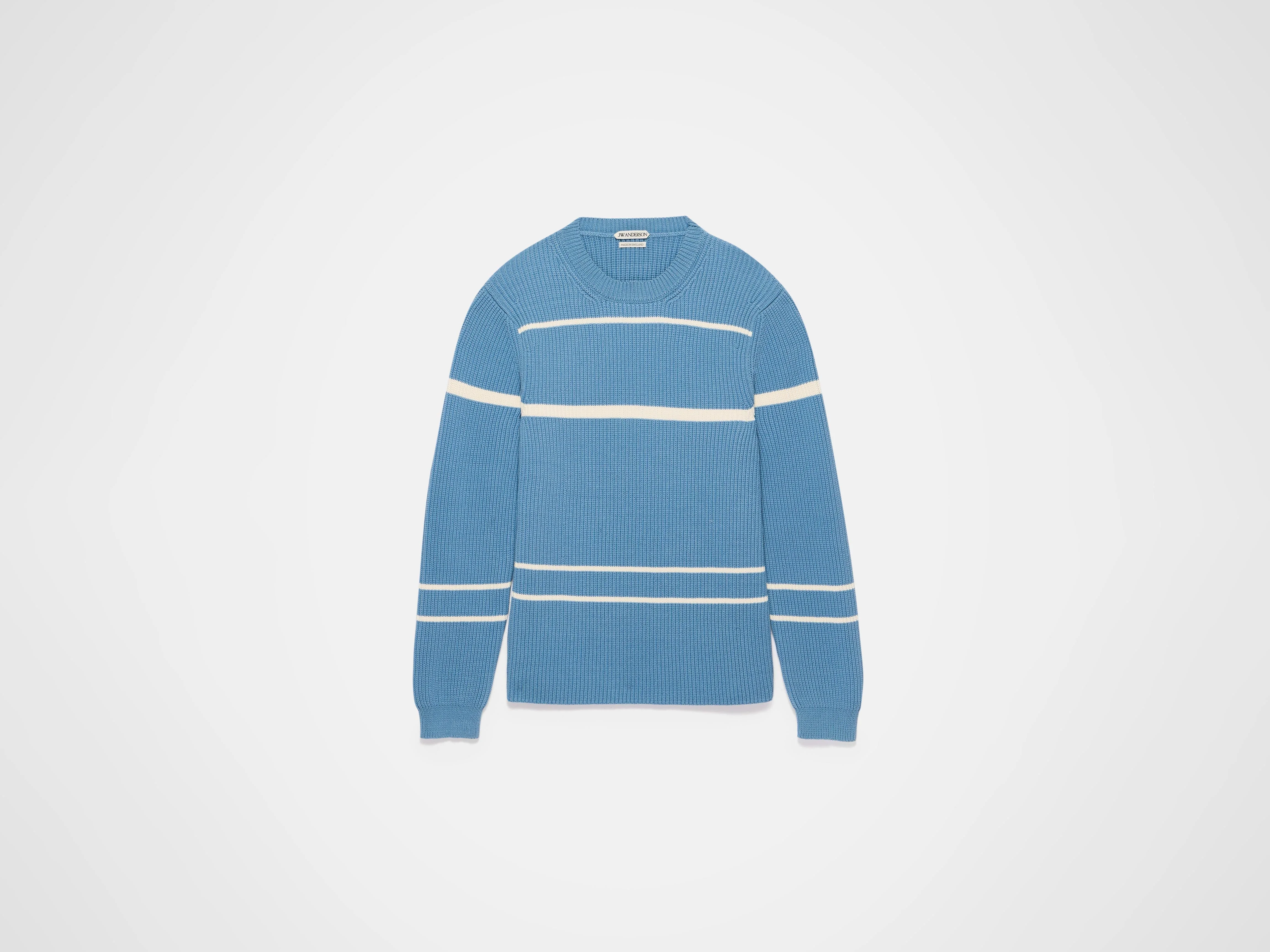 A design inspired by Lucie Rie ceramics. Knitted striped jumper in steel blue knit. Features a half cardigan rib, a slim, longline silhouette with a chunky, soft cotton hand feel. Details - Colour: Steel Blue - Composition [Main]: 74% Cotton, 26% Polyamide - Made in: United Kingdom - Model [Wears]: Size M, 184cm Tall - SKU: KW1511YN0486768