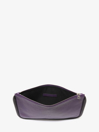 - Pouch with oversized padded tubular detail - Silver tone logo embossing on outer panel - Zip closure with branded zip puller - A4-size - Silver tone hardware Additional Information - Colour: Purple - Dimensions L: 38 cm H: 26 cm W: 2 cm - Outer: 80% Full Grain Calf Leather, 20% Full Grain Lamb Leather - Lining: 40% Polyester, 40% Polyamide, 20% Elastance - Hardware: 100% Zamak - Made in Hungary