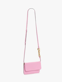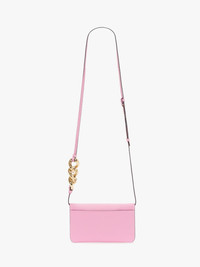- Phone pouch with adjustable leather strap - Three gold-tone chain link detailing - Front flap opening with embossed logo - Gold-tone hardware Details - Colour: Pink - Dimensions L: 54cm / H: 52cm / W: 50cm - Outer: 100% Full Grain Calf Leather - Lining: 60% Polyamide, 40% Polyurethane - Hardware: 50% Brass, 50% Zamak - Made in Hungary