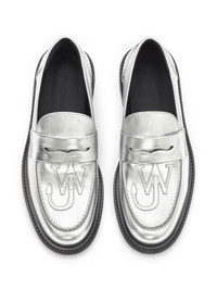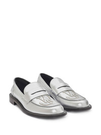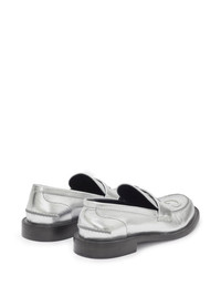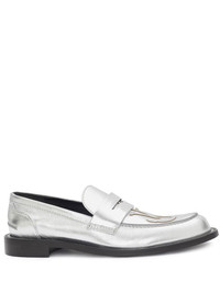 logo-patch leather moccasin loafers silver-tone lambskin/calfskin/calf leather logo patch to the front metallic finish crossover strap detail round toe slip-on style flat leather sole low heel Made in Italy Composition Outer: Lambskin 100% Sole: CALFSKIN 100% Lining: Calf Leather 100%