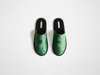 Close Toe Slide in Emerald silk. Crafted in Italy, this slide features an upper made from silk jacquard upholstery fabric, woven by British specialists in historic damask silk. Designed for comfort as well as refinement, it is finished with a foam insole, a nubuck leather outsole suitable for indoor and outdoor wear, and the JW Anderson logo woven label on the insole. Details - Colour: Emerald - Composition [Outer]: 100% Silk - Composition [Lining]: 100% Silk - Composition [Outsole]: 100% Split Grain Calf Leather - Made in: Italy - SKU: FL0002PG1888540