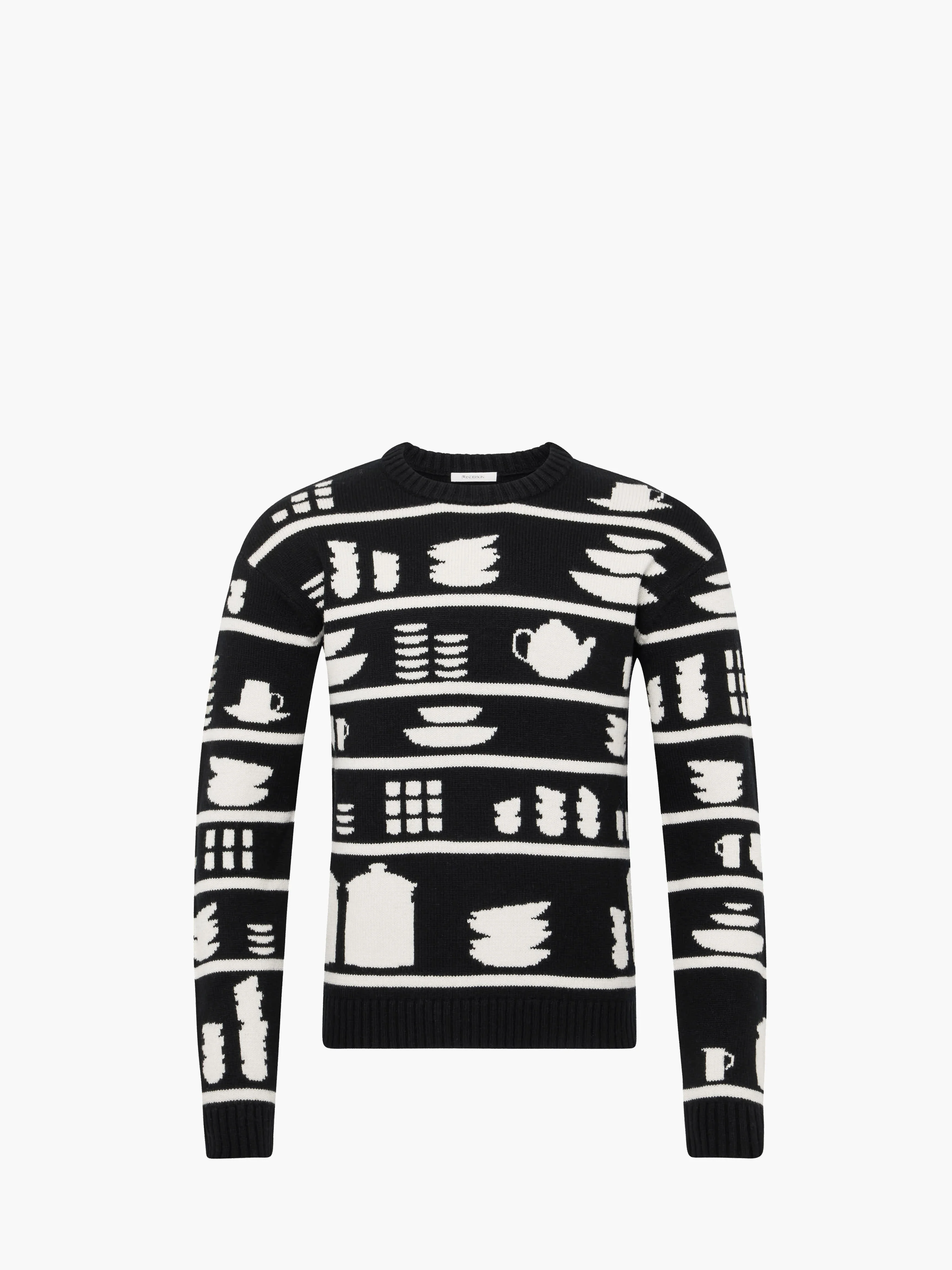 - Relaxed fit jacquard jumper with abstract crockery knit design - Dropped shoulder - Ribbed cuffs, neck and hem - Intarsia stitch Details - Colour: Black/White - Composition: 100% Lambswool - Mid weight - Made in: China - SKU: KW1431YN0379901