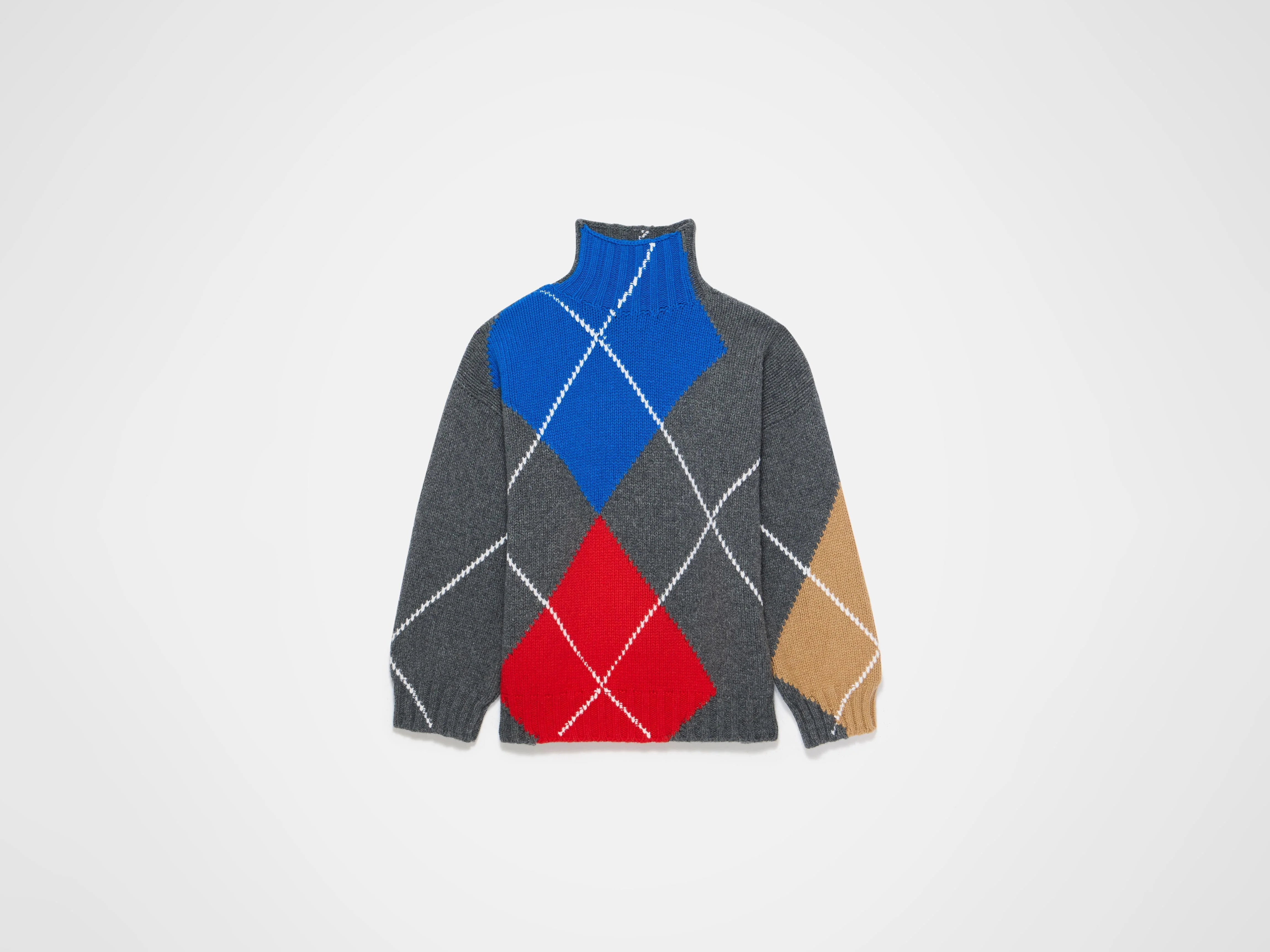 JW Anderson x Pringle men's knitted Argyle turtleneck in charcoal natural Scottish wool. Features an oversized silhouette and an exaggerated argyle design. Constructed with intarsia ribs for a seamless finish. Made in Scotland as part of the Pringle collaboration. Details - Colour: Charcoal Melange - Composition [Main]: 100% Lambswool - Made in: United Kingdom - Model [Wears]: Size M, 185cm Tall - SKU: KW1549YN0470972
