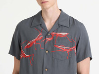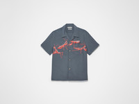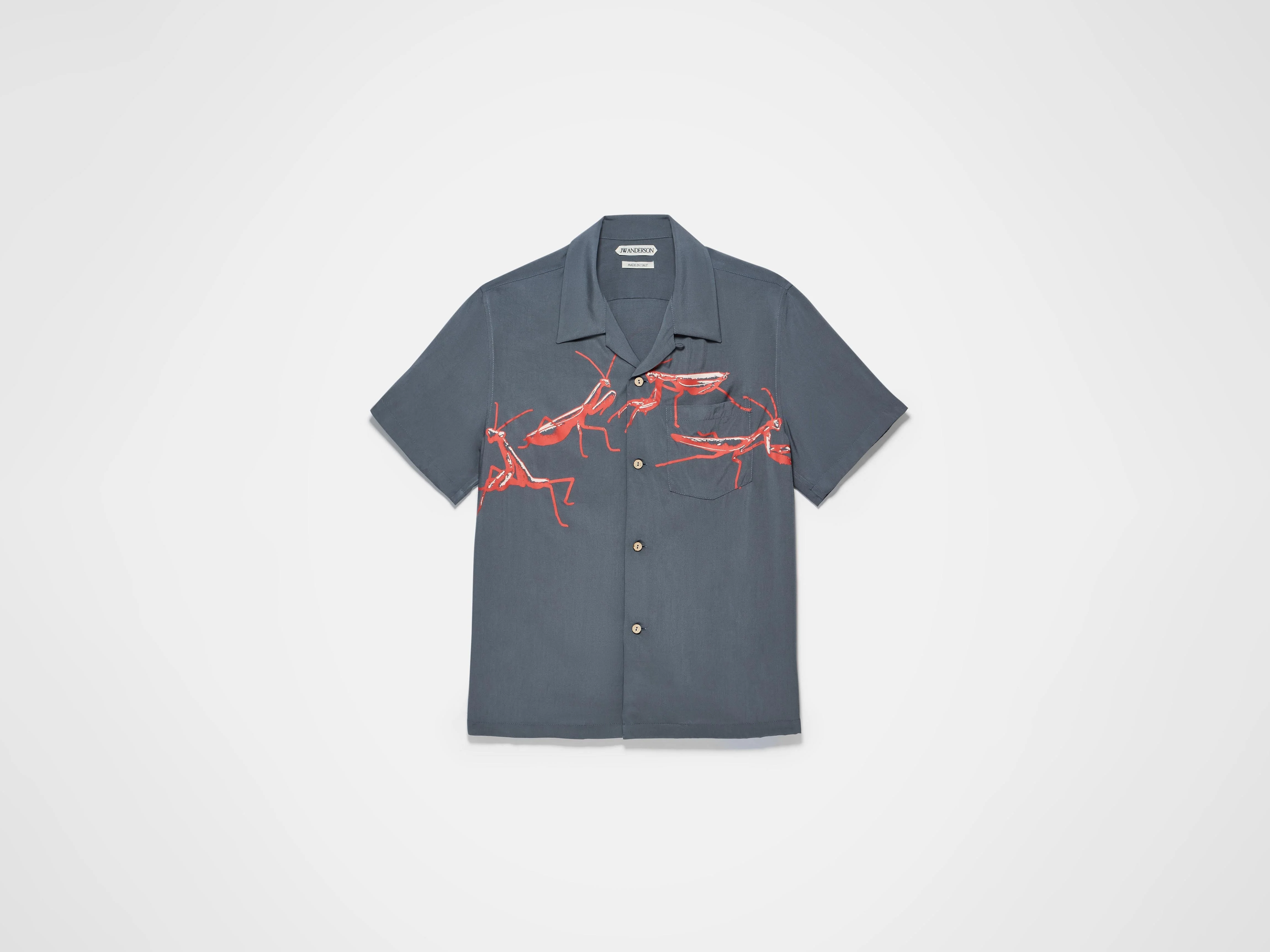 Camp collar in steel fluid viscose, with short sleeves. Features a praying mantis screen print finished with mother of pearl buttons. Details - Colour: Steel - Composition [Main]: 100% Viscose - Made in: Italy - Model [Wears]: Size 46, 189cm Tall - SKU: SH0378PG1942925