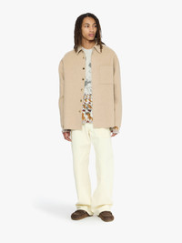- Oversized shirt jacket complete with dropped shoulder silhouette - Concealed button placket with one visible top button - Patch pocket on chest - Buttoned cuffs - Black buttons - Logo embossed raw leather patch at centre back - Unlined Details - Colour: Clay Melange - Composition: 100% Wool - Double construction - Brushed fabrication - Made in: China - SKU: JK0396PG1559118