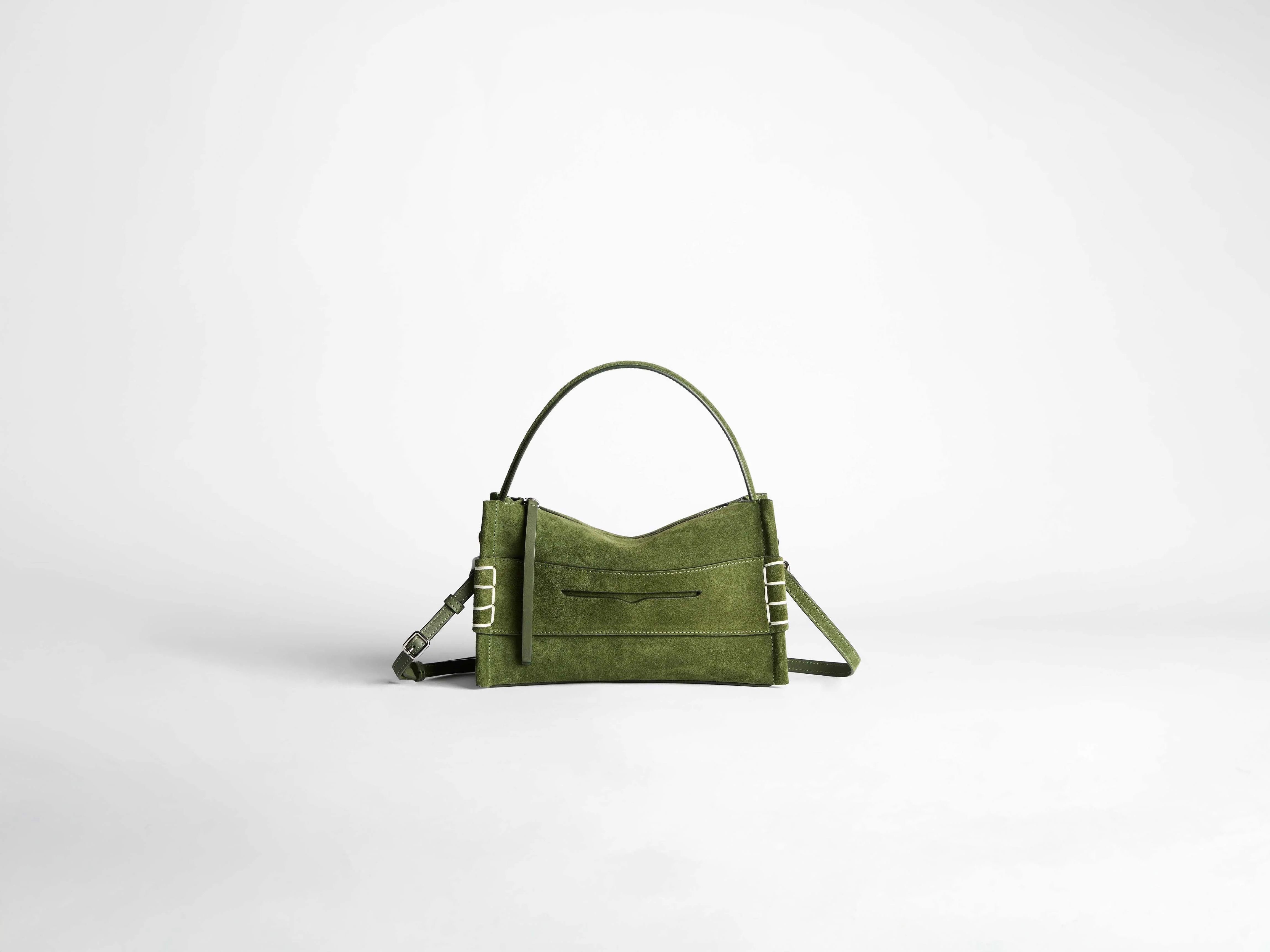 Crafted in Italy. The small Loafer Bag in khaki soft suede. The signature silhouette, compacted. Featuring a top handle and removable cross body strap, with silver finish hardware. Every detail is carefully considered. The penny keeper, sewn by hand with box stitches, wrapping over four times, reminiscent of the shoe itself. The base mimics the sole of a loafer, stitching details reflect the welt of a shoe. Precisely cut, edge-painted and logo embossed leather is meticulously assembled, for a seamless fit. Craftmanship, refined, in an elegant form. Details - Colour: Khaki - Composition [Main]: 80% Split Grain Calf Leather, 20% Full Grain Calf Leather - Composition [Lining]: 100% Lamb Leather - Composition [Hardware]: 100% Zamak - Measurements: [H] 15cm | [L] 25cm | [W] 8cm - Made in: Italy - SKU: HB0762LA0364575
