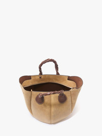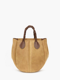 - Twisted leather top handle tote bag - Contrasting dark leather trims - Detachable leather crossbody strap with dog clip fastening - Zip top opening and closure with branded puller - Fold in sides with magnetic closure - Silver logo embossing on back panel - Silver tone hardware - Inner leather pocket with blind logo embossing - Suede lining - Can be worn on the shoulder Details - Colour: Caramel - Dimensions: H: 29cm / W: 39cm / D: 13cm - Outer: 70% Suede 30% Full Grain Calf Leather - Lining: Polyamide 40% Polyurethane - Hardware: 100% Zamak - Made in Hungary - SKU: HB0681LA0319604