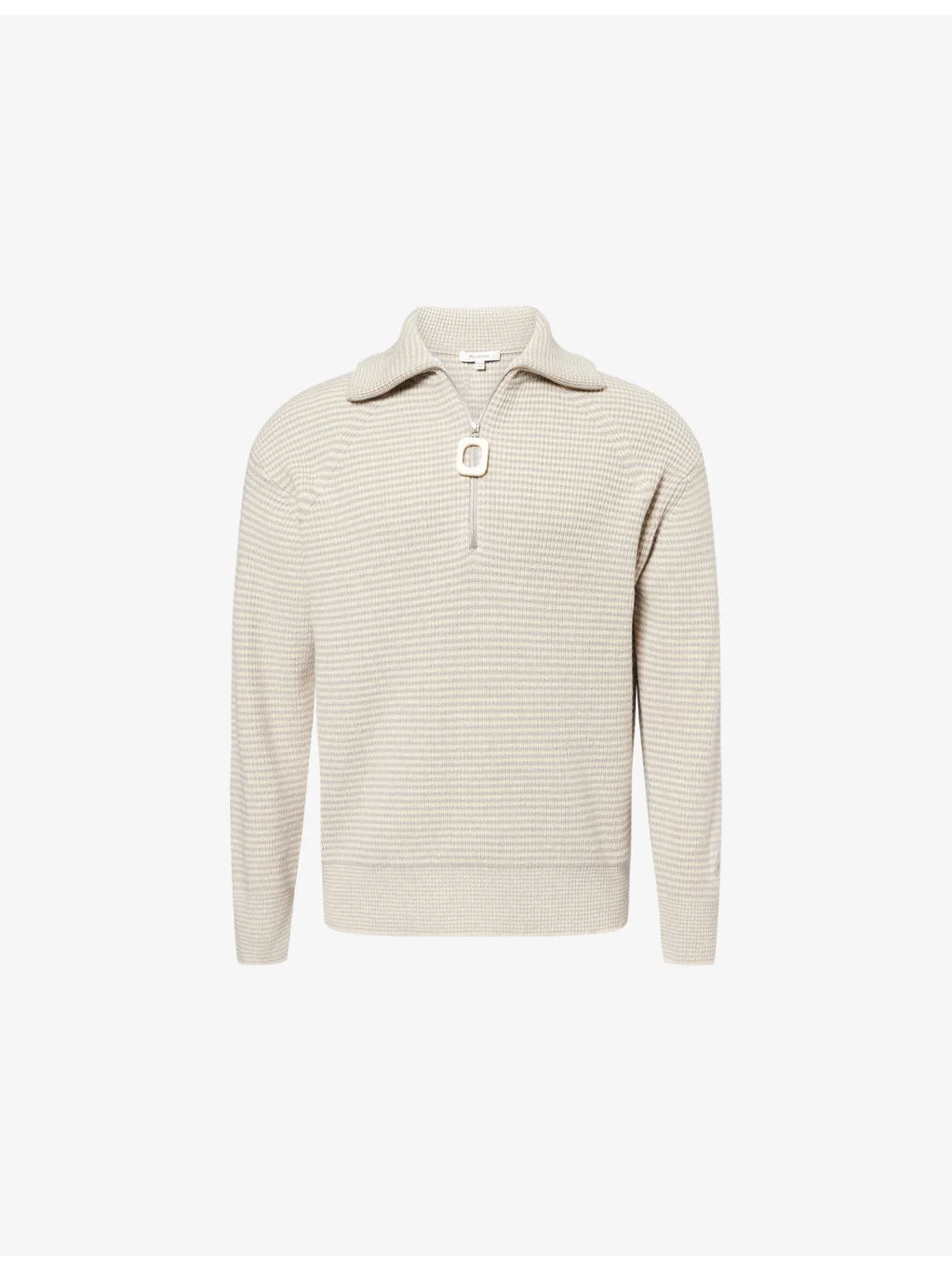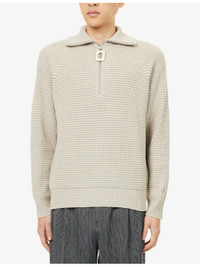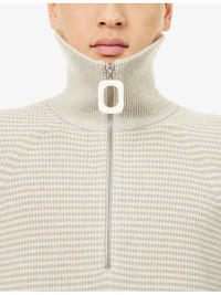 PRODUCT DETAILS - JW ANDERSON knitted jumper - 46% polyamide, 29% cotton, 24% sheeps wool, 1% elastane - Relaxed fit, funnel neck, hardware zip puller, long raglan sleeves, striped knitted pattern - Hand wash - Model is 6ft 2in/1.88m and wears a size medium - Midweight, stretchy Ref: R04492810