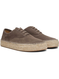 Calfskin suede espadrilles in taupe. · Lace-up closure · Logo printed at tongue · Logo patch at braided jute footbed · Canvas lining · Blanket stitching at welt · Braided jute platform midsole · Treaded rubber sole · Platform: H1.5" Supplier color: Taupe Upper: calfskin. Sole: textile, rubber. Made in Spain 251477M229003
