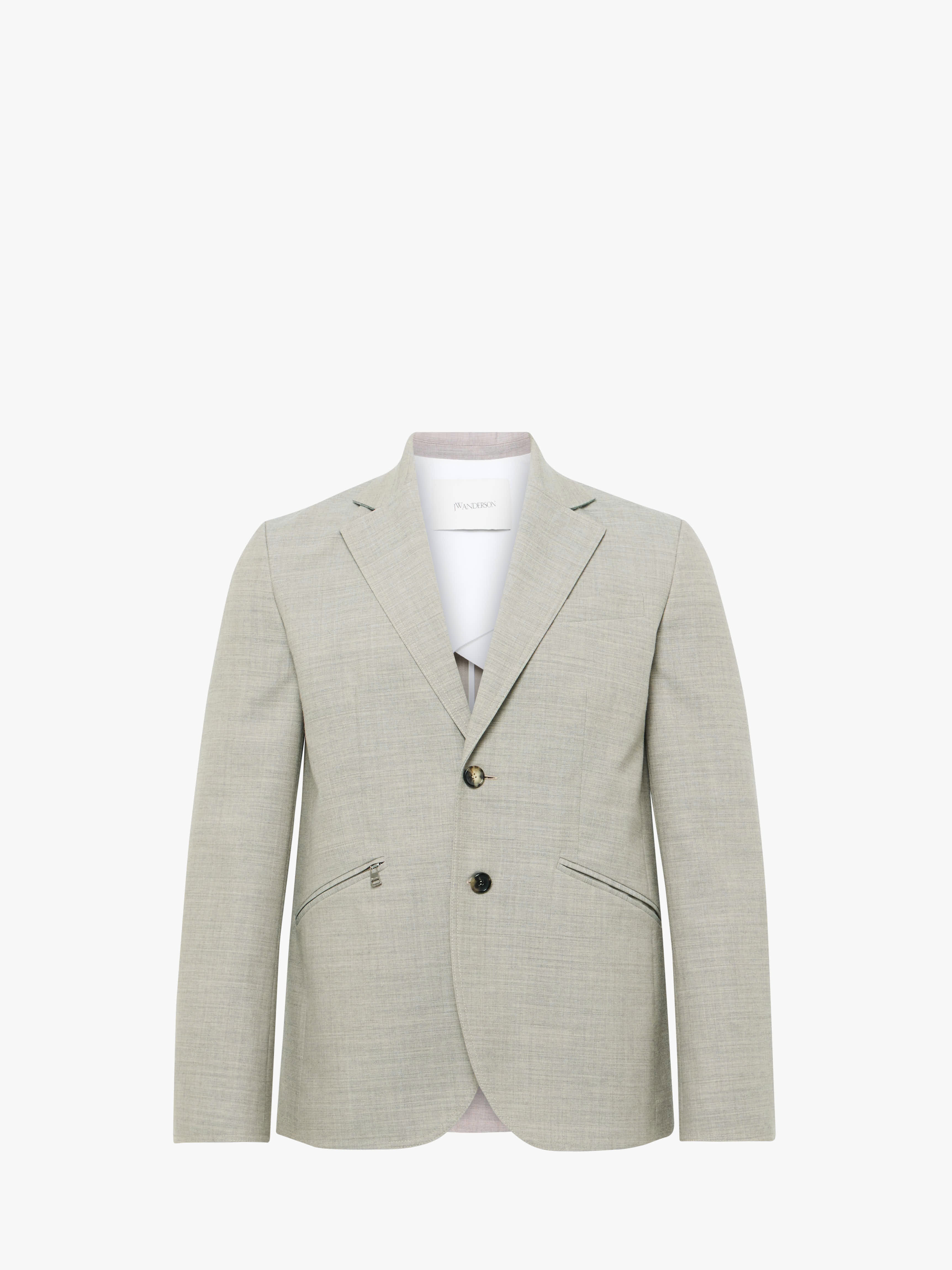 - Relaxed fit tailored blazer jacket with frontal button fastening - Horn buttons - Slanted pockets with zip on right side - Contrast half lining Details - Colour: Clay Melange - Composition: 100% Wool - Sleeve length: 92cm - Centre back length: 75cm - Twill construction - Made in: Romania - SKU: JK0391PG1821118