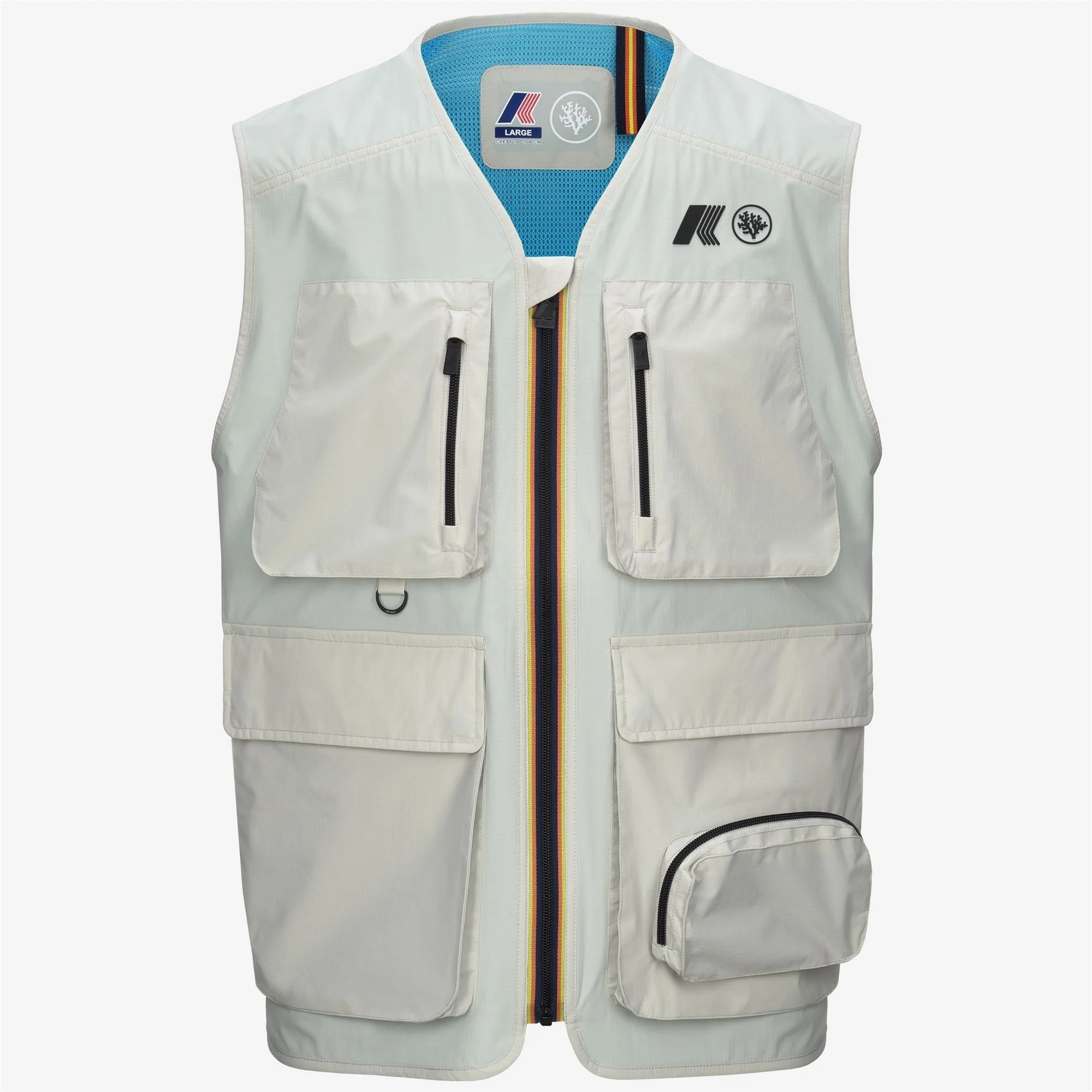 Beige Grey Unisex Outdoor Vest with Recycled Nylon and Pockets Allos is a vest made from recycled nylon ripstop fabric with a regular fit that facilitates movement and ventilation during sports activities. The attention to functional details is highlighted by the zip closure and practical pockets, ideal for storing small essentials during outdoor activities. The interior is lined with light blue mesh. It is personalized with the K-WAY x CORAL GARDENERS logo. - Waterproof and water-repellent recycled nylon ripstop fabric - Heat-taped seams - Zip closure - Internal wind flap - Ventilation cut on the back - 2 upper pockets with zips - 2 flap pockets with snap button - Side zips for hem adjustment - Regular fit - K-WAY x CORAL GARDENERS logo Features Description: Jackets, Vest Gender: Unisex Season: Spring, Summer, Fall, Winter Composition Entire: 30% Poliuterano Termopla, 70% Recycled Nylon Style: K4141JW - Color: 634