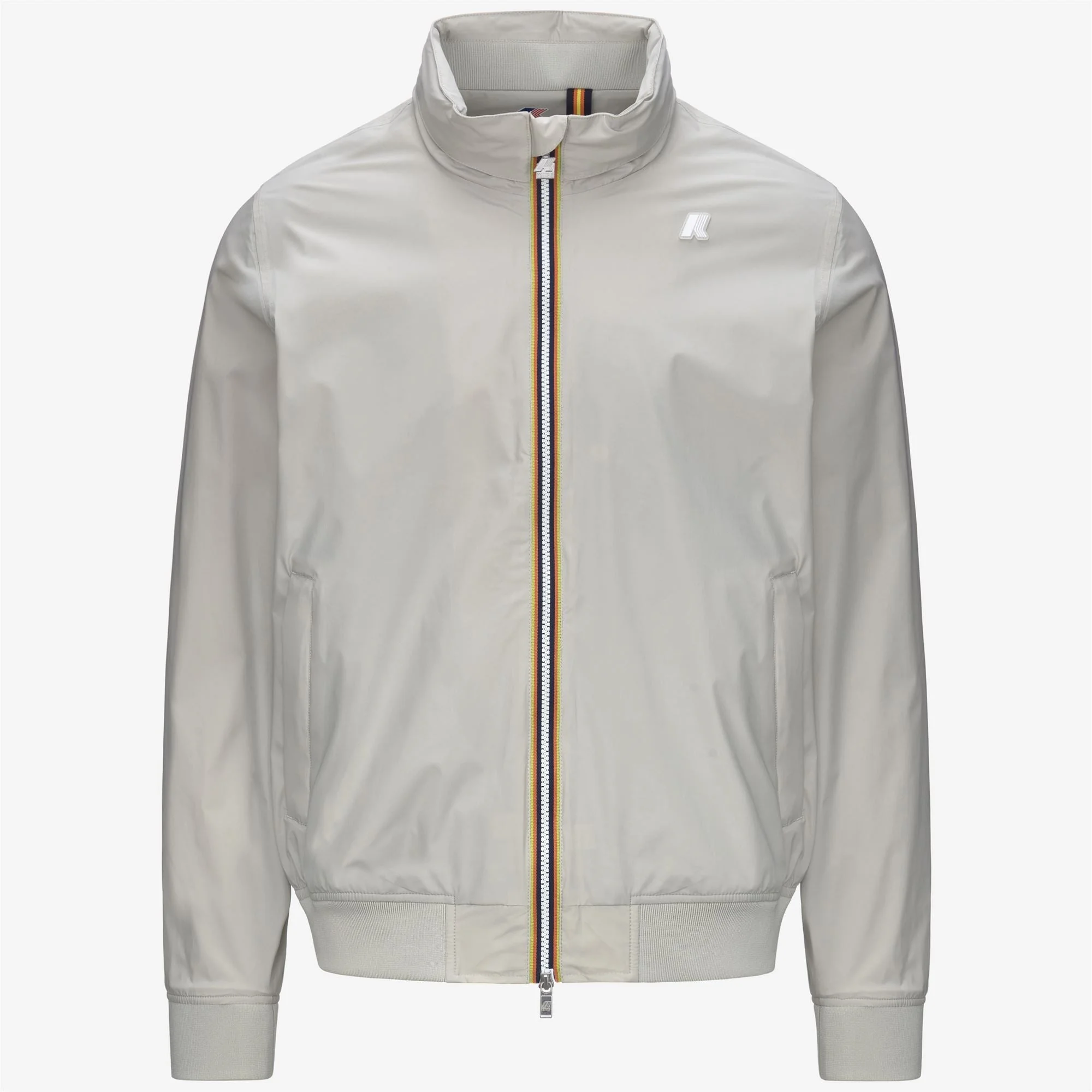Beige Grey Men's Weatherproof Short Jacket with Stretch Nylon Amaury is a men's short jacket that merges a casual, urban look with K-Way's technical features. It is made from weather-proof stretch nylon and finished with a soft grey melange cotton jersey lining only on the front and back, which provides superior comfort, excellent protection and a comfortable feel on the skin. The interior is finished with meticulous attention to detail: there are heat-taped seams and the iconic multicoloured K-Way tape at the waist for a distinctive signature touch. - Waterproof, windproof, breathable stretch nylon fabric - Cotton jersey lining - Heat-taped seams - Folding hood tucked into the collar - Zip closure - Ribbed cuffs and hem - 2 zipped pockets - Ventilation cut-out on the back - White silicone logo Features Description: Jackets, Short Gender: Man Season: Spring, Summer Composition Lining B: 100% Nylon External: 5% Elastane, 95% Nylon Lining: 100% Cotton Lining A: 100% Cotton, 35% Polyester Style: K3123VW - Color: 634