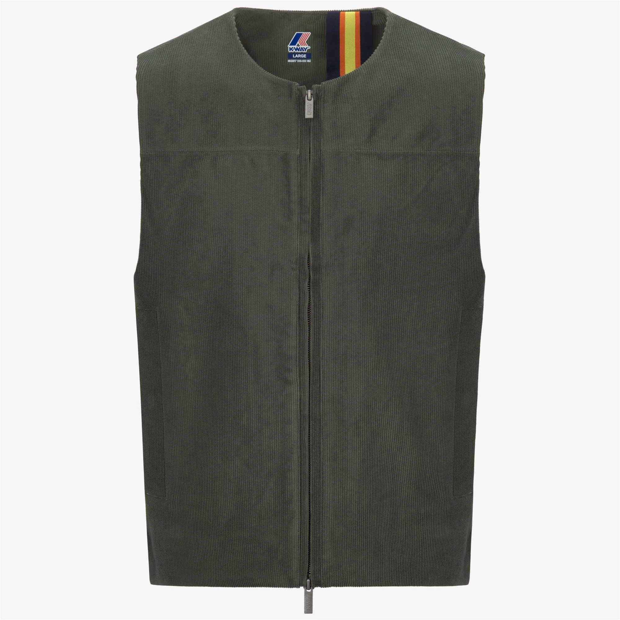 Green Men's Corduroy Vest with PrimaLoft Padding Barry is a men’s vest with a classic, laid-back design, ideal for autumn wear. Made from technical corduroy-effect fabric, it features lightweight PrimaLoft® padding and a soft checked wool-blend lining. Details include a rounded collar, zip fastening with protective flap, and an adjustable drawcord hem. - Technical corduroy-effect fabric - Wool-blend lining - Lightweight eco-friendly PrimaLoft® padding - Medium warmth rating - Rounded collar - Zip fastening with protective flap - Adjustable drawcord hem - 2 side flap pockets - Regular fit - K-Way tape detail on the inside Features Description: Jackets, Vest Gender: Man Season: Fall, Winter Composition External: 100% Polyester Lining: 5% Wool, 95% Recycled Polyester Style: K71369W - Color: B2F