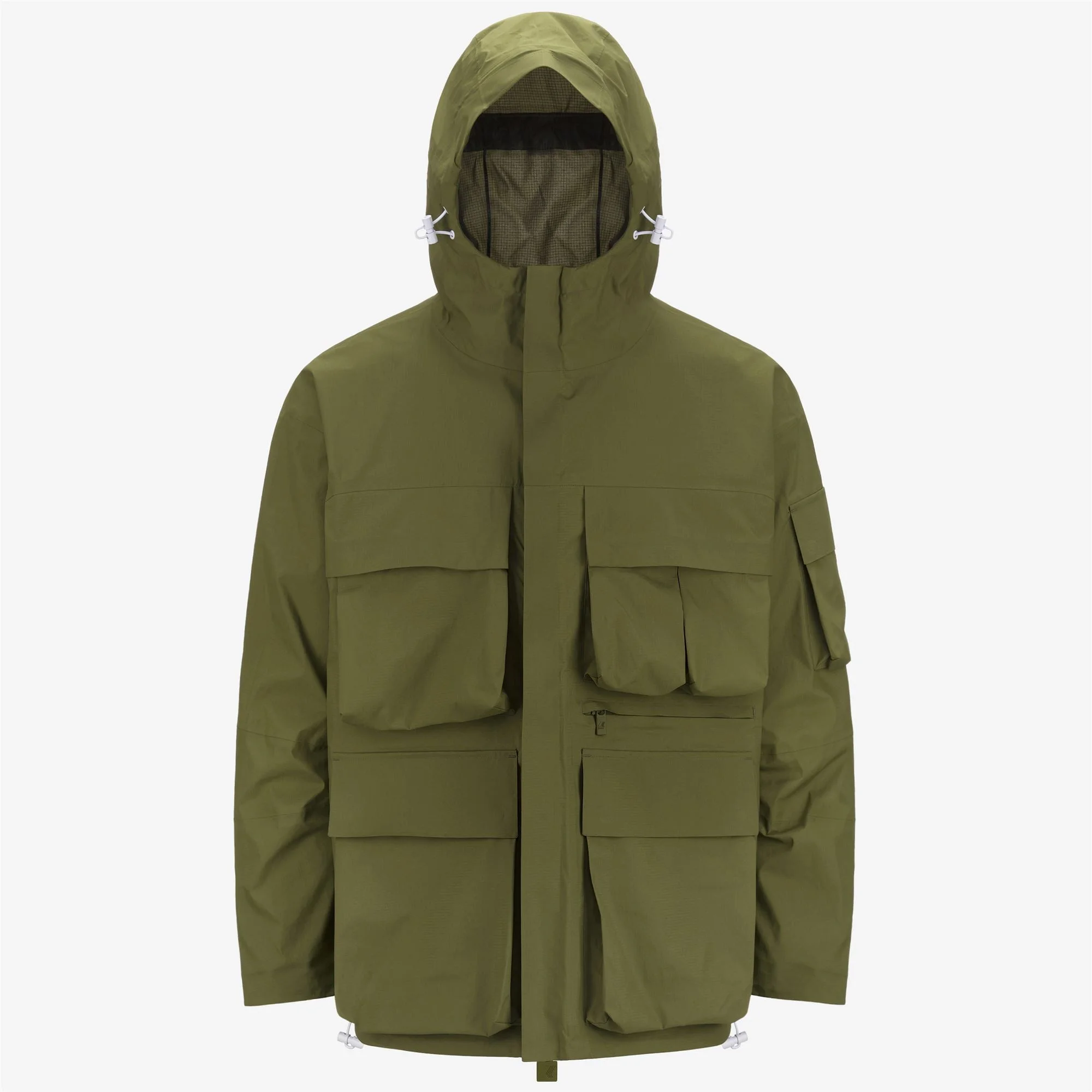 Sphagnum green Unisex Waterproof Mid Jacket for City Wear Claudel is a short jacket with a sporty and loose fit design, ideal for mid seasons. It is made from a 3-layer technical fabric that is windproof and waterproof up to 5000 water columns, providing comfort against the skin. The jacket stands out for its utility style, featuring a full zip construction with a enveloping hood, elasticized cuffs, and an adjustable lower hem with a drawstring. It includes 4 large front flap pockets, a pocket on the sleeve, and a rear pocket that allows the garment to be packed away. Amiable is the K-Way project that combines functionality and environmental respect. This garment is made from 100% recycled and recyclable nylon, finished with windproof thermosealed seams, also made from recycled materials. Features Description: Jackets, Mid Gender: Unisex Season: Spring, Summer Composition Entire: 49% Nylon, 21% Polyester, 30% Poliuretane Style: K1122KW - Color: XZ0
